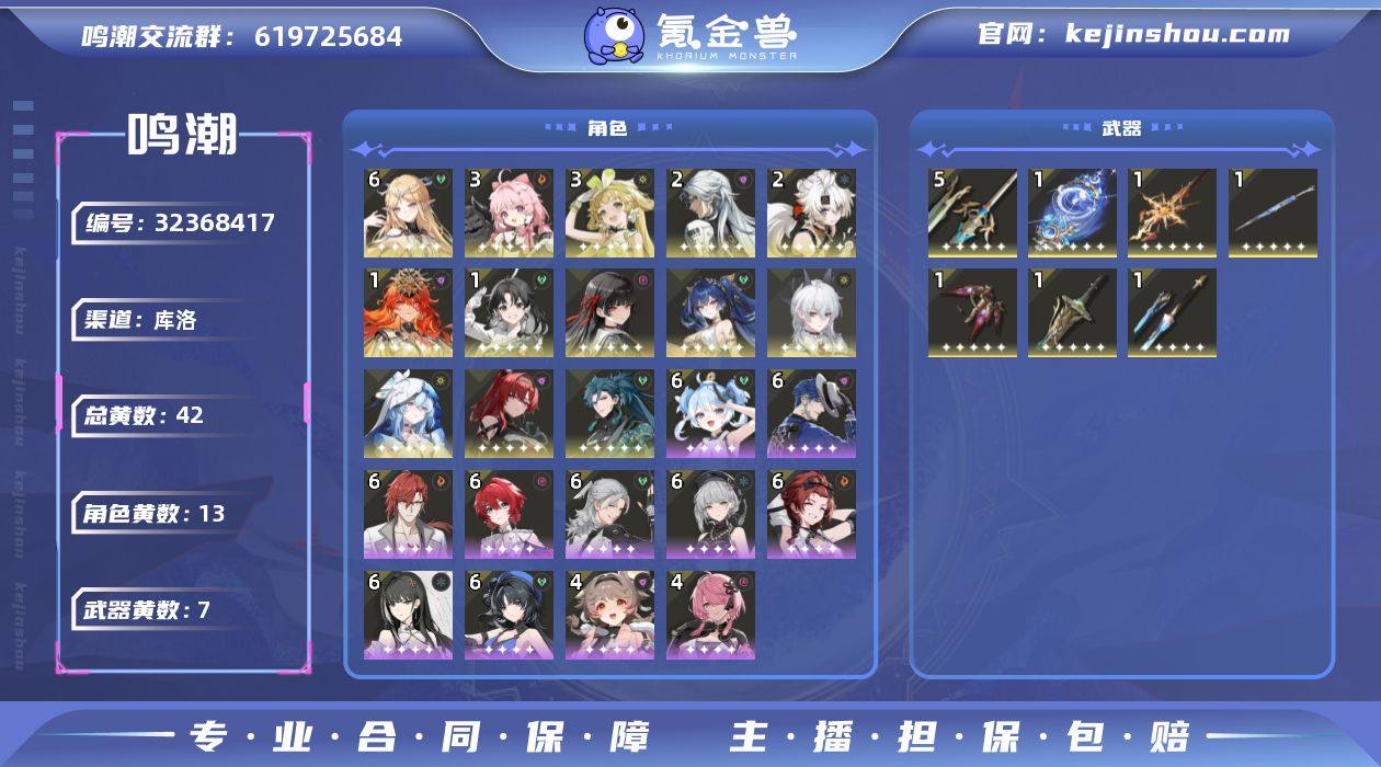 6加1卡提,其余角色基本有专武,大世界随便乱杀,星声还有些,武器池差10来发就出了