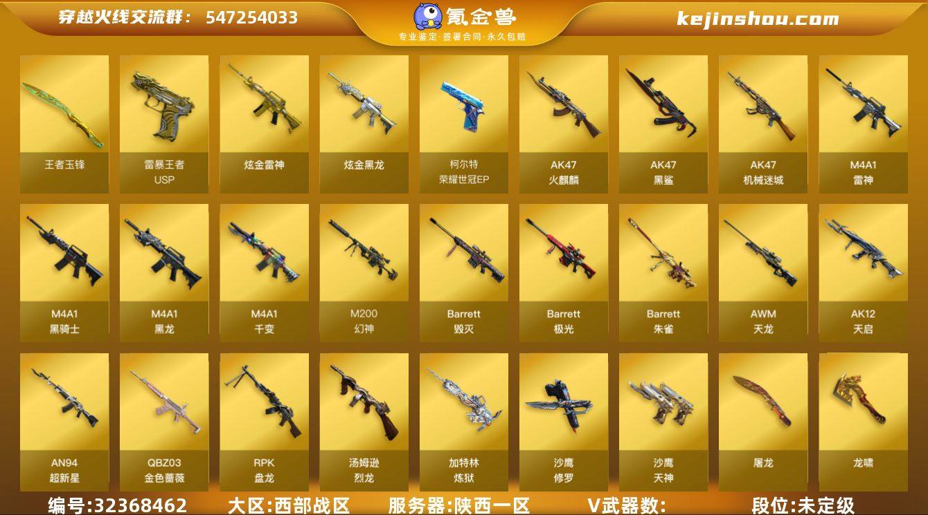 陕西一区-70V-6王者-0炫金 【热门武器】:QBZ03-金色蔷薇,HK417-朱雀,M200-幻神,荣耀世冠-柯尔特,M4A1-黑骑士*2,USP-雷暴,沙鹰-修罗*2 【音效卡】:AK47-火麒麟音效卡,M4A1-雷神音效卡,M4A1-黑骑士音效卡,Barrett-毁灭音效卡,Barrett-碧霄极光音效卡*2,白虎-盛典舞曲音效卡,炼狱-百战金芒-庆典舞曲音效卡 【皮肤】:幻神-丹凤,幻神-青鹤,幻神-KZ-CFPLS25冠军 皮肤,QBZ03-荣耀世冠白鲨,QBZ03-CFS2024 皮肤*2,Kar98K-星神-AG-CFPLS21冠军皮肤,雷神-冠军之魄,雷神-CFS十周年纪念版 皮肤,M4A1-再燃火线,火麒麟-雷神*2,火麒麟-平天大圣,火麒麟-心动糖果,毁灭-CFS2020,黑龙-暗月,屠龙-巅峰荣耀 皮肤,轻型军用手斧-再燃火线,麒麟刺-甜蜜糖果 皮肤 【角色】:零,迷迭香,电竞教官-云悠悠,王者-瞳-闭月羞花,王者-零,王者玲珑,乔伊教练,云海玲珑,初恋灵狐,电竞少女,嘉年华灵狐,娟娟,猎狐者-追月,零-水下丽影,灵狐者-X,麻雀,潘多拉-X,潘多拉-甜心教官,莎莎,斯沃特-X,铁骑荣耀,樱-战斗天使,影武者-X,游珑儿 【人偶武器】:AWM-灵狐-15周年嘉年华,迷你深渊冰龙*2,迷你波特博士,夺魂,深渊终结者手雷,迷你艾比 【暴走生化】:超级对讲机 【挑战大师】:AK47-冰龙粉碎者,冰龙粉碎者-白马银枪,VEPR-12-金魔,激光毁灭者III,神圣爆裂者-末日III 【英雄级武器】:M4A1-千变,AK47-火麒麟*2,M4A1-黑龙,M4A1-雷神*3,M4A1-黑骑士*2,HK417-朱雀,M4A1-夜魔,无影-神兵利器,黑武士-锦绣游龙,QBZ03-金色蔷薇,王者之心-觉醒版,王者之魄-觉醒版,黑骑士-海王,AWM-天龙*3,Barrett-毁灭,Barrett-极光,AWM-裁决,M200-幻神,王者之怒-觉醒版,王者之力-觉醒版,炼狱-百战金芒,AA-12-雷霆,沙鹰-修罗*2,沙鹰-天神,USP-雷暴,荣耀世