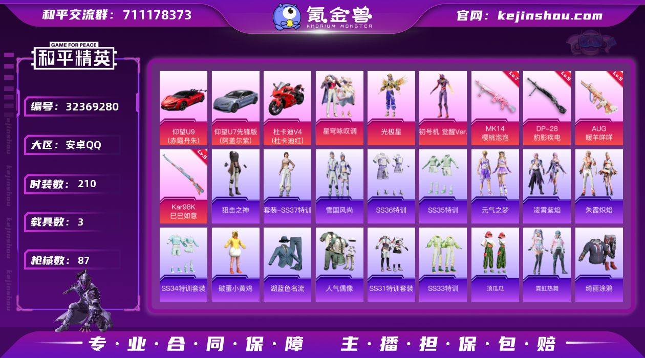 热力值:54138 载具数:1 时装数:565 枪械数:171 战备数:124 游戏等级:57 卓越印记:1 传奇印记:1 绝世印记:0 花灵,彩虹鹿灵,赤焰黑爵,橘柚倾心,洛天依,千金淑猫,山涧鹿灵,樱桃泡泡 五级DP-28-豹影疾电,五级Kar98K-巳巳如意,五级MG3-洛神天依 保时捷Panamera(梦幻青) 炫彩糖果降落伞,炫彩糖果飞行器,喜羊羊与灰太狼降落伞,碧影闪光降落伞,橘柚倾心降落伞,恐龙拽拽降落伞,林间仙鹿降落伞,洛神天依降落伞,千金淑猫降落伞,童趣迷兔降落伞,旋转彩虹降落伞,荧海星豚降落伞,樱桃泡泡降落伞 SS37特训,SS36特训,炫彩糖果,粉黛兰香,绯色魅影,萌鸡速递,风迹短诗,秘语星愿,SS35特训,午间小调,元气之梦,漫游都市,懒羊羊,美羊羊,喜羊羊,薄荷星砂,云魄琉璃,凌霄紫焰,擎苍青焰,SS34特训套装,游乐,朱霞炽焰,冰川特警,滨海厨神,滨海假日,白糯汤圆,白色伏地魔,雏菊兔兔,长空猛禽,潮流游乐家,顶瓜瓜,大橘大利,都市丽猫,都市魅力,电音精灵,飞驰魅影,绯格组合,福星高照,瑰梦爱神,光之冒险,海岛探路者,鹤鸣,虎虎生威吉莉,湖蓝色名流,黑色伏地魔,黄色伏地魔,灰色格斗者,黄色名流,黄色运动,红色运动,幻世战舞者,幻影武者,酒红色名流,橘黑制服,竞技达人朋克,竞技名士,极乐追光,极速红龙,街头潮人,街头风暴,锦衣飞扬,空投萌叽,蓝冰羽,蓝彩潮人,蓝海鲸歌,龙魂突击队,猎鹰,萝兰蝴蝶,蓝色运动,恋语绒绒,冷焰舞者,摩登魅猫,猛禽,棉花软糖,魅力单车,蜜桃派对,梦魇先生,霓虹极客,霓虹街区,怒火燎原,霓虹热舞,柠萌假日,牛气冲天,浓情蜜辣,牛气满满,破蛋小黄鸡,破晓战魂,轻风白浪,绮丽涂鸦,青年教官,青团波波,云朵鹅,绒宝小鹅,瑞龙福将,软萌银虎,人气偶像,软软马卡龙,日照花林,深蓝色名流,SS17特训,SS18特训,SS19特训,SS20特训,SS21特训,SS27特训,SS28特训,SS29特训,SS30特训套装,SS31特训套装,SS32特训套装,SS33特训套装,巳巳如意,探宝勇士,天籁歌者,甜蜜熊情侣,糖霜甜心,糖糖葫芦,特训学院,团圆交子,特战装甲,完美偶像,炫蓝之夏,雪绒豹,旭日情侣,夏日音浪,雪兔飞飞,香桃花海,星途旅人,异彩先驱,耀粉歌者,音速流光,玉兔迎春,鹰眼刺客,鱼渊荷华,燕燕于飞,异域银装,战地督导,战地菁英,智谋强哥,紫幽梦,灼焰舞者 ACE32-冰晶雪宝,PKM-啾咪啾咪,MK12-乌木金纹,SCAR-L-天象三御,铝热弹-炫彩糖果,UZI-炫彩糖果,AKM-霓彩脉冲,Famas-霓彩脉冲,SLR-霓彩脉冲,SVD-霓彩脉冲,DBS-风迹短诗,蜜獾-风迹短诗,MK12-风迹短诗,Mk47-风迹短诗,莫辛纳甘-风迹短诗,破片手榴弹-拽到爆炸,S12K-霓彩脉冲,SCAR-L-彩虹符号,AKM-涂鸦街区,AUG-紫晶流影,AMR-喜羊羊与灰太狼,爆炸猎弓-喜羊羊与灰太狼,电击枪-喜羊羊与灰太狼,MG-36-薄荷星砂,P90-玩趣呆呆,AC-VAL-闲梦青缨,AKM-虎虎生威,AKM-恐龙拽拽,AKM-霓虹街区,AKS-74U-鸡智如我,ARX-凌霄紫焰,AUG-天降萌叽,AUG-耀粉歌者,AWM-恐龙拽拽,AWM-庄周梦蝶,DBS-彩虹符号,DBS-幻彩电音,大砍刀-云朵鹅,DP-28-彩虹符号,DP-28-橘柚倾心,G36C-星穹咏叹调,GROZA-异彩先驱,GROZA-荧海星豚,GROZA-紫翼圣骑,JS9-凌霄紫焰,Kar98K-飞驰魅影,Kar98K-灵符少年,Kar98K-蓝