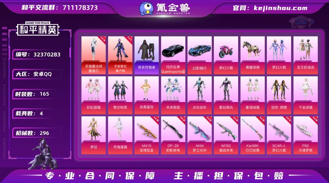 安卓 手Q-2神装-13粉装-17特效枪-4载具-13粉色飞行器-107269热力值-7王牌印记-165套装-296枪皮 【红色神装等级】:灵猫魔法师-塞维尔(三级),宇宙意志-塞卢姆(一级) 【红色角色神装】:灵猫魔法师-塞维尔,宇宙意志-塞卢姆 【热门品类】:粉装-梦幻火箭,套装-奇异狩猎者,套装-龟仙人,角色-8号机,撬棍-龙胆亮银枪 【粉色套装】:粉装-宝贝奶油派,粉装-梦幻火箭,粉装-彩虹甜喵,粉装-青空秋雨,角色-呆萌星弥,粉装-未来歌姬,角色-冰炎战车,角色-紫钛骑兵,粉装-蜜语绒猫,套装-创世·救赎,角色-千金淑猫,角色-罗征,角色-荧海星豚 【粉色枪皮等级】:AKM-梦之光华(五级),AKM-星际浪客(二级),SCAR-L-梦幻火箭(四级),SCAR-L-青春物语(三级),SCAR-L-魔童闹海 哪吒(三级),M416-至情至圣(九级),M416-墨龙九天(一级),M416-灵猫魔法师(三级),GROZA-旋转彩虹(二级),GROZA-精灵之光(三级),M762-激战未来(五级),P90-冷漠罗丽(四级),Kar98K-巳巳如意(五级),Kar98K-圣域龙灵(三级),Mk14-精灵梦叶罗丽(四级),DP-28-豹影疾电(五级),MG3-洛神天依(四级) 【粉色载具】:玛莎拉蒂Quattroporte(夜幕蓝),幻影随行,双人摩托-梦幻火箭,僚机-圣域龙宝,黑曜夜骑 【粉色...