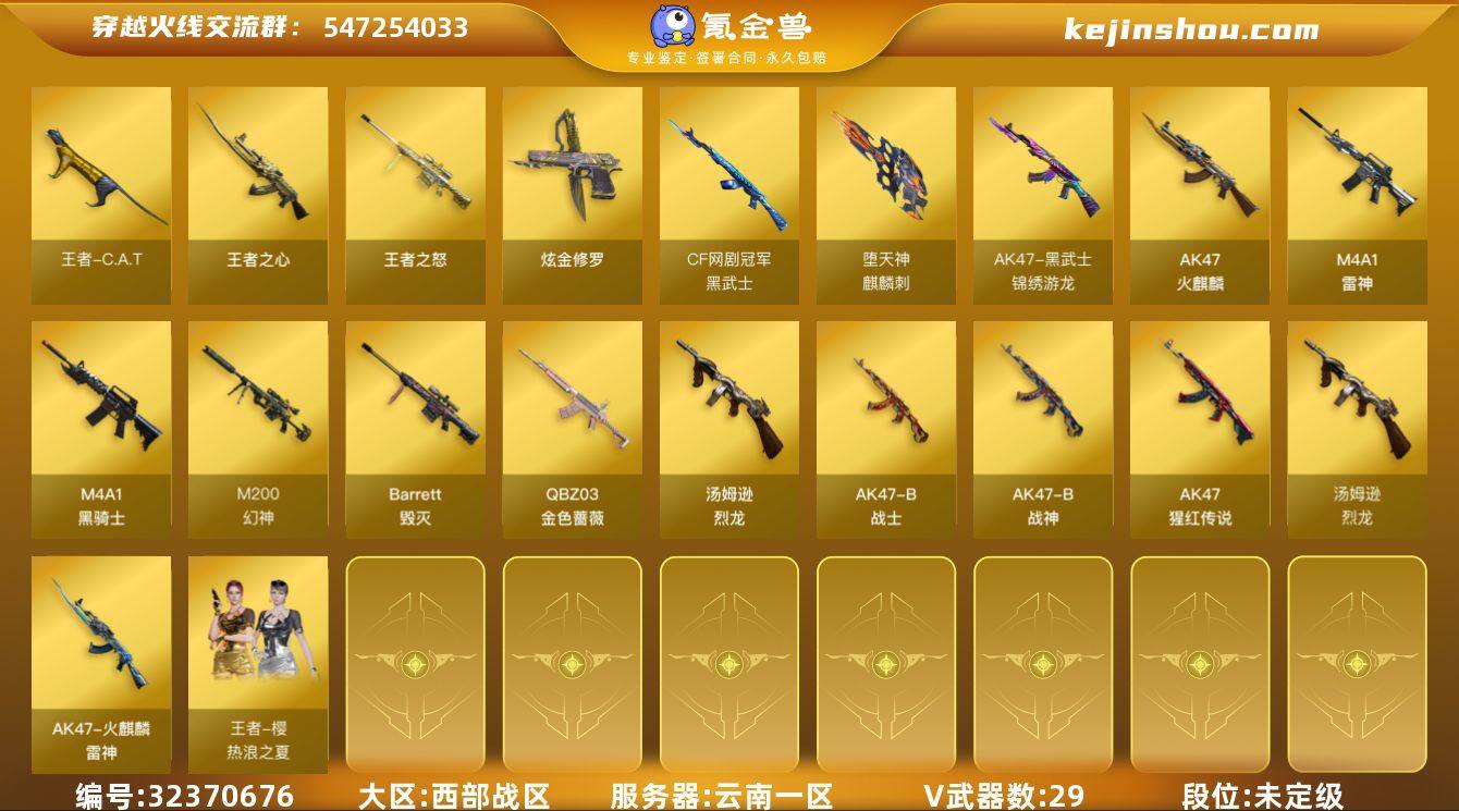 MCF877【29v 幻神 2王者】【等级】100【区服】云南一区【段位】传奇3【英雄角色】1【英雄武器】17【王者级武器】高爆手雷-雷暴王者 王者之心 王者之怒【炫金级武器】炫金修罗 炫金骑士 炫金骑士【英雄级角色】樱 【英雄级武器】 加特林-炼狱 屠龙-斗烈龙驹 M4A1-雷神 闪光弹-神工天巧 高爆手雷-神工天巧 烟雾弹-神工天巧 QBZ03-金色蔷薇 黑武士-锦绣游龙 黑武士-CF网剧冠军 AK-47-猩红传说 麒麟刺-堕天神 烟雾弹-堕天神 高爆手雷-堕天神 闪光弹-堕天神 AK47-火麒麟 AK47-B-战神 AK47-B-战士 汤姆逊-烈龙 M200-幻神 M4A1-黑骑士 加特林-炼狱 Barrett-毁灭 【源级武器】源-火麒麟 II 魂·M4A1-雷神-化蛇 源-毁灭 III 魂·毁灭-航天科技 源·屠龙 源-裁决 源-千变 源-擎天 源-裁决 源·天神 魂·裁决-星际旅行 魂·Barrett-朱雀- 新春神龙 魂·炼狱-玩具枪 魂·雷神-新春神龙 魂·雷神-宇航兔兔 灵·Barrett-金色蔷薇-甜蜜火力 源·毁灭 源·黑骑士 源-裁决 源·龙啸 源-黑龙 源·毁灭 魂·雷神-诺拉 魂·QBZ03·金色蔷薇-序章 魂·裁决-凤灵 源·天龙 源·天神 源·黑骑士 源·天启 源-黑龙 火麒麟-雷神 源·青龙 魂·龙啸-NICE 源·擎天-萌杀 御·黑龙-龙太子 御·黑骑士-白马银枪 魂·毁灭-青帝 火麒麟-...