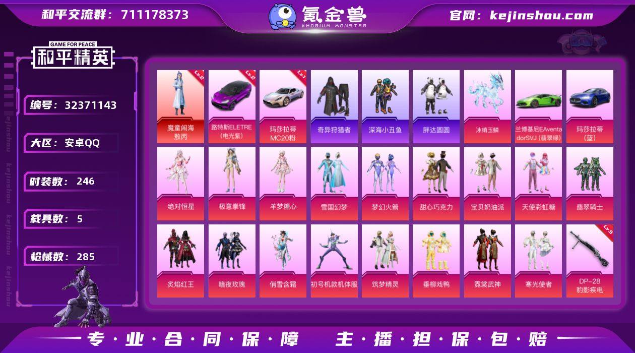 可二次【特价出售/店主推荐】安卓 手Q-1神装-18粉装-11特效枪-5载具-5粉色飞行器-114206热力值-8王牌印记-246套装-285枪皮【红色载具】:路特斯ELETRE(电光紫)(二级),玛莎拉蒂MC20(幻星粉)(一级)【红色角色神装】:魔童闹海-敖丙【热门品类】:粉装-雪国幻梦,粉装-梦幻火箭,套装-浪漫天命,套装-深海小丑鱼,套装-小丑鱼,套装-奇异狩猎者,角色-军刀雅典娜,套装-胖达圆圆,套装-金羽特工,套装-星河浪客,套装-龟仙人,套装-粉红小猪【粉色套装】:角色-绝对恒星,粉装-甜心巧克力,粉装-宝贝奶油派,粉装-天使彩虹糖,粉装-雪国幻梦,粉装-梦幻火箭,粉装-翡翠骑士,粉装-炙焰红王,粉装-暗夜玫瑰,粉装-俏雪含霜,角色-初号机款机体服,粉装-筑梦精灵,粉装-垂柳戏鸭,粉装-霓裳武神,粉装-寒光使者,角色-羊梦糖心,粉装-极意拳锋,角色-罪夜之冕【粉色枪皮等级】:AKM-甜心宝贝(五级),M16A4-垂柳戏鸭(三级),SCAR-L-青春物语(四级),M416-风花雪月(四级),AKS-74U-森灵之息(五级),P90-魔童闹海 敖丙(三级),Kar98K-绿意幻情(五级),Kar98K-巳巳如意(五级),Mk14-福马献瑞(二级),M249-绝对恒星(三级),DP-28-豹影疾电(五级)【粉色载具】:路特斯ELETRE(电光紫...