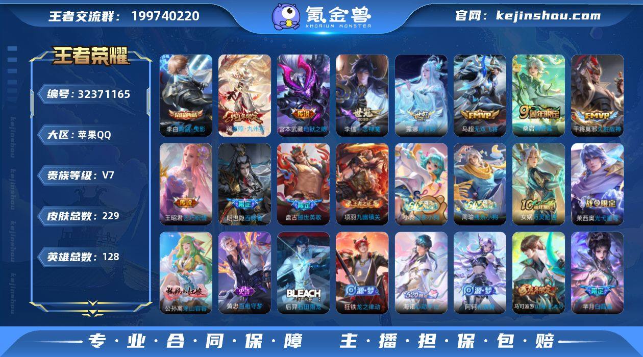 苹果Q-V7-最强王者段位-126英雄-305皮肤-4典藏皮肤-9传说-86史诗 【英雄全皮】:孙权全皮,狂铁全皮 【荣耀典藏】:孙悟空全息碎影,李白鸣剑曳影,诸葛亮星域神启,铠银白咏叹调 【传说皮肤】:后羿神树通天,桑启鸣野蒿,夏侯惇霜北刀,孙悟空齐天大圣,鲁班七号寅虎瑞焰,诸葛亮时雨天司,孙悟空零号赤焰,曜云鹰飞将,宫本武藏地狱之眼 【限定皮肤】:白起狰,夏侯惇霜北刀,虞姬夏日便利店,姜子牙天穹之誓,狄仁杰阴阳师,虞姬凯尔特女王,赵云皇家上将,墨子神迹守卫,嬴政白昼王子,孙尚香蔷薇恋人,鲁班七号寅虎瑞焰,庄周高山流水,高渐离死亡摇滚,高渐离玩趣恶龙,芈月重明,吕布猎兽之王,元歌云间偶戏,元歌无心,夏侯惇朔风刀,甄姬游园惊梦,曹操烛龙,典韦穷奇,典韦蓝屏警告,马可波罗暗影游猎,狄仁杰魔术师,狄仁杰万华元夜,达摩星际陆战队,达摩沙漠行僧,项羽海滩派对,老夫子醍醐杖,老夫子航海奇遇记,程咬金演武夺筹,王昭君午后时光,兰陵王金庭之子,亚瑟潮玩骑士王,孙悟空大圣娶亲,孙悟空零号赤焰,孙悟空孙行者,孙悟空齐天大圣,牛魔御旌,李元芳云中旅人,钟馗驱傩正仪,女娲朔望之晖,雅典娜单词大作战,雅典娜黎明之约,太乙真人饕餮,太乙真人华丽摇滚,鬼谷子原初探秘者,鬼谷子五谷丰年,诸葛亮时雨天司,铠青龙志,苏烈千军破阵,百里玄策原初追逐者,弈星混沌棋,沈梦溪大漠名商,明世隐疑决卦,裴擒虎李小龙,裴擒虎擒涛扼浪,狂铁御狮,狂铁电玩高手,米莱狄御霄,米莱狄胡桃异想国,云中君纤云弄巧,盾山御銮,猪八戒西部大镖客,上官婉儿梁祝,嫦娥拒霜思,嫦娥暖冬兔眠,蒙犽狂想玩偶喵,鲁班大师探海日志,桑启海盐诗旅,暃星界游侠,戈娅驭风魔法,艾琳流音漫舞,司空震地狱燃心,阿古朵江河有灵,张良古海寻踪,蒙犽百解令,高渐离燃音魔法,妲己灵卜魔法,鬼谷...