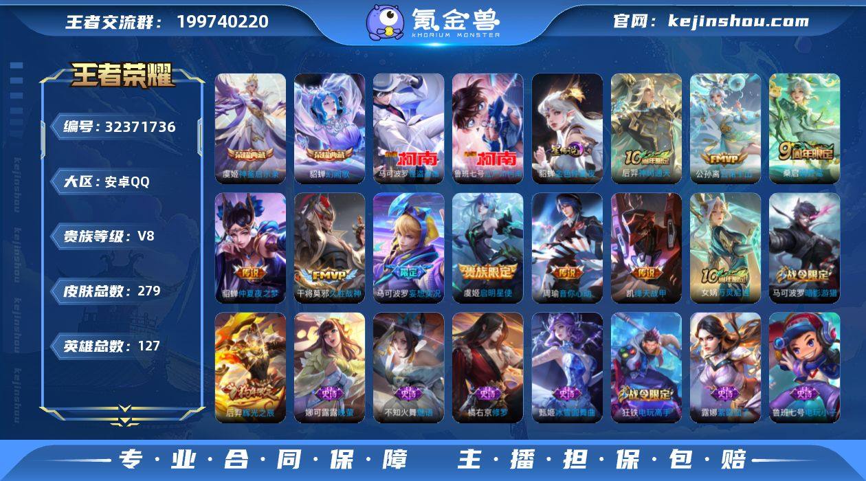 V8 2典藏 2珍品 10传说 1星元 279皮肤 127英雄 【2水晶】貂蝉-幻阙歌,虞姬-神鉴启示录【2珍品传说】马可波罗-怪盗基德,鲁班七号-江户川柯南【10传说】貂蝉-仲夏夜之梦,干将莫邪-久胜战神,铠-绛天战甲,虞姬-启明星使,周瑜-音你心动,马可波罗-妄想实况,桑启-鸣野蒿,公孙离-云诺千山,后羿-神树通天【1星元】貂蝉-金色仲夏夜之梦【58史诗】元歌-无心,弈星-滕王阁序,狂铁-电玩高手,阿轲-迷踪丽影,安琪拉-心灵骇客,白起-星夜王子,百里守约-特工魅影,不知火舞-魅语,蔡文姬-舞动绿茵,蔡文姬-繁星吟游,嫦娥-拒霜思,妲己-魅力维加斯,狄仁杰-魔术师,狄仁杰-鹰眼统帅,貂蝉-圣诞恋歌,貂蝉-逐梦之音,宫本武藏-鬼剑武藏,后羿-辉光之辰,花木兰-水晶猎龙者,橘右京-修罗,兰陵王-暗隐猎兽者,李白-千年之狐,李元芳-逐浪之夏,廉颇-地狱岩魂,刘邦-德古拉伯爵,刘禅-绅士熊喵,露娜-紫霞仙子,鲁班七号-电玩小子,鲁班七号-狮舞东方,吕布-圣诞狂欢,吕布-末日机甲,马可波罗-暗影游猎,墨子-金属风暴,墨子-龙骑士,娜可露露-晚萤,裴擒虎-李小龙,孙尚香-水果甜心,孙尚香-蔷薇恋人,王昭君-偶像歌手,夏侯惇-乘风破浪,小乔-缤纷独角兽,小乔-青蛇,雅典娜-黎明之约,亚瑟-心灵战警,杨玉环-遇见飞天,嬴政-优雅恋人,嬴...