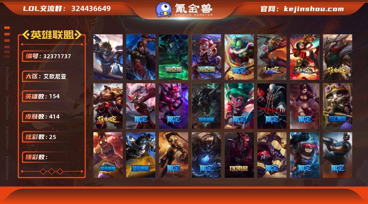167英雄-600皮肤-120炫彩-段位:undefined 锦鲤娜美 黎明使者索拉卡 SSG霞 玉剑传说苍鸾 勇者阿狸 银河魔装机神安妮 战斗学院拉克丝 至臻黑夜使者李青 至臻黑夜使者凯隐 至臻电玩女神凯特琳 至臻星之守护者辛德拉 至臻星之守护者妮蔻 至臻未来战士锤石 北辰之威内瑟斯 春晖神女拉克丝 福牛守护者菲奥娜 烈焰美人薇恩 美猴王孙悟空 南天之怒沃里克 神龙烈焰金克丝 司马懿仲达 替父从军花木兰 醒狮克格莫 玉净夜叉凯特琳 紫金罗刹莫甘娜 海克斯科技雷克顿 海克斯科技斯维因 海克斯科技嘉文四世 海克斯科技波比 恐惧新星德莱厄斯 零之枪骑赫卡里姆 摄魂使者薇恩 冰雪驯鹿波比 冰雪女神辛德拉 寒冬精灵璐璐 平安夜女神娑娜 魄罗骑士瑟庄妮 圣诞老人布隆 圣诞糖果棒厄运小姐 大元素使拉克丝 DJ娑娜 海克斯科技波比 海克斯科技嘉文四世 海克斯科技雷克顿 海克斯科技斯维因 恐惧新星德莱厄斯 零之枪骑赫卡里姆 十周年纪念安妮 摄魂使者薇恩 神凰行者瑞羽圣凰艾尼维亚 新卧虎藏龙贾克斯 源代码乐芙兰 至臻电玩女神凯特琳 至臻黑夜使者凯隐 至臻黑夜使者李青 至臻未来战士锤石 至臻星之守护者妮蔻 至臻星之守护者辛德拉 至臻玉剑传说武剑仙 暗杀星奥莉安娜 暗杀星蒙多 暗杀星努努和威朗普 暗杀星慎 暗影沃里克 奥德赛吉格斯 北辰之威内瑟斯 冰雪节辛吉德 冰雪女神辛德拉 冰雪驯鹿波比 春晖神女拉克丝 电玩女神厄运小姐 电玩勇者锐雯 都铎王朝图奇 防暴士兵辛吉德 防暴天使凯尔 Fnatic古拉加斯 Fnatic迦娜 Fnatic嘉文四世 Fnatic卡尔萨斯 Fnatic库奇 福牛守护者菲奥娜 钢铁军团拉克丝 钢铁之翼艾尼维亚 冠军典狱长锤石 冠军之矛卡莉丝塔 冠军之刃锐雯2016 冠军之血希瓦娜 鬼影森森茂凯 鬼影重重魔腾 海贼瑞兹 寒冬精灵璐璐 胡桃夹子萨科 鸡里奥 烈焰美人薇恩 灵能特工易 美猴王孙悟空 魅惑女巫崔丝塔娜 魅惑女巫奈德丽 密林...