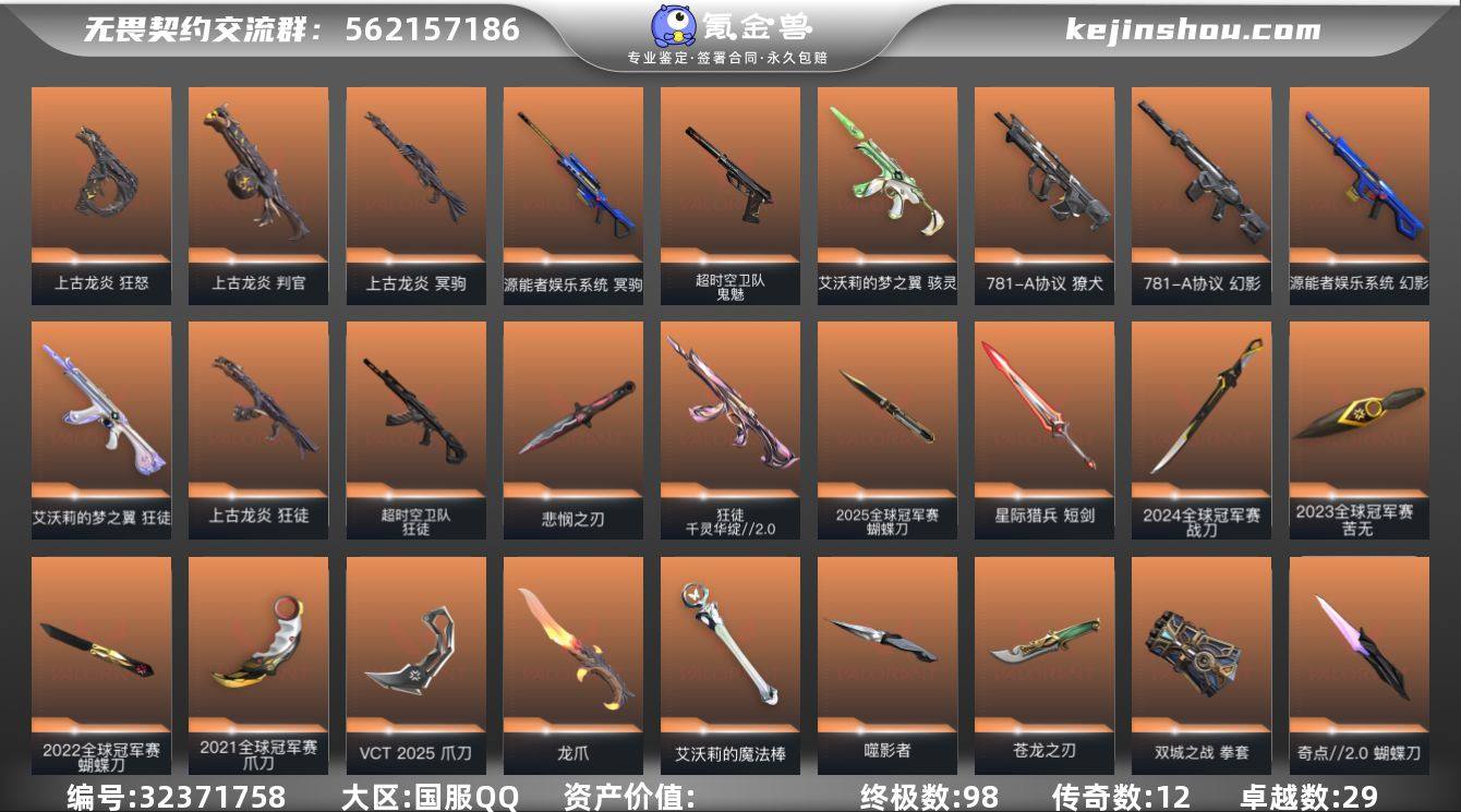 【Hww441】Q区 皮肤价值275050 【98橙皮 12金皮 29紫皮 272皮肤 28英雄 232卡面 2250已用源晶】 优质装备:2025冠军套,2024冠军套,2023冠军套,2022冠军套,2021冠军套 【套装】:2025全球冠军赛套装,2024全球冠军赛套装,2023全球冠军赛套装,2022全球冠军赛套装,2021全球冠军赛套装,上古龙炎套装,无畏契约季前邀请赛套装,光荣异象套装,虚空遗器套装,VCT 2025 赛季套装,西部未来套装,创·纪元套装,RGX 11z Pro//3.0套装,混沌序曲套装,《双城之战》收藏套装,归零者套装,偃月苍龙套装,VCTxEDG 队伍套装,英雄之选套装,天界神兵套装,堕天遗武套装,般若假面//2.0套装,魄月玄兔套装 【英雄】:幻棱,炼狱,维斯,暮蝶,钛狐,壹决,铁臂,捷风,雷兹,幽影,不死鸟,贤者,猎枭,蝰蛇,零,芮娜,奇乐,尚勃勒,霓虹,斯凯,夜露,星礈,K/O,海神,盖可,黑梦,钢锁 【近战武器】:近战武器-2025全球冠军赛 蝴蝶刀,近战武器-2024全球冠军赛 战刀,近战武器-2023全球冠军赛 苦无,近战武器-2022全球冠军赛 蝴蝶刀,近战武器-2021全球冠军赛 爪刀,近战武器-碎心裂刃,近战武器-无畏契约季前邀请赛 悲悯之刃,近战武器-魔术火花,近战武器-影钩,近战武器-超...