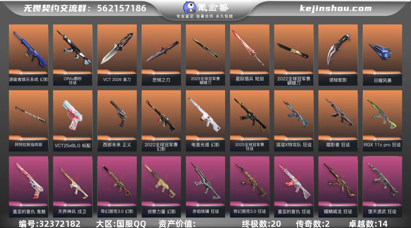 【套装】:2025全球冠军赛套装,2022全球冠军赛套装,VCT 2026 赛季套装,无畏契约季前邀请赛套装 【英雄】:幻棱,炼狱,维斯,暮蝶,钛狐,壹决,铁臂,捷风,雷兹,幽影,不死鸟,贤者,猎枭,蝰蛇,零,芮娜,奇乐,尚勃勒,霓虹,斯凯,夜露,星礈,K/O,海神,盖可,黑梦,钢锁 【近战武器】:近战武器-2025全球冠军赛 蝴蝶刀,近战武器-2022全球冠军赛 蝴蝶刀,近战武器-碎心裂刃,近战武器-VCT 2026 篆刀,近战武器-无畏契约季前邀请赛 悲悯之刃,近战武器-魔术火花,近战武器-影刃,近战武器-诡秘蛇影 军刀,近战武器-日耀风暴 遗器,近战武器-阿特拉斯指挥部 甩棍,近战武器-星际猎兵 短剑,近战武器-魔术火花 【狂徒】:狂徒-2025全球冠军赛,狂徒-噬影者,狂徒-RGX 11z Pro,狂徒-滋滋X特攻队,狂徒-ORA x 颗秒,狂徒-堕天遗武,狂徒-掠影,狂徒-盖亚的复仇,狂徒-日冕雄师,狂徒-耀鳞威龙,狂徒-紫阙金琅,狂徒-离子武器//2.0,狂徒-奇幻朋克//3.0,狂徒-赤焰铁骥,狂徒-诡秘蛇影 【幻影】:幻影-2022全球冠军赛,幻影-电音光谱,幻影-源能者娱乐系统,幻影-侦察力量,幻影-奇幻朋克//3.0,幻影-末日之翼,幻影-电音光谱 【戍卫】:戍卫-天界神兵,戍卫-折光棱晶...