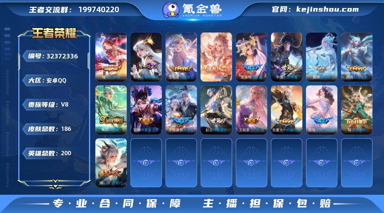 【编号71296 可秒换绑店长推荐捡漏号!】安卓Q-V8-至尊星耀II段位-123英雄-222皮肤-1典藏-0珍品无双-0无双-0珍品传说-11传说-49史诗 【荣耀典藏】:孙悟空全息碎影 【内测皮肤】:孙尚香蔷薇恋人 【传说皮肤】:孙悟空地狱火,宫本武藏地狱之眼,孙尚香末日机甲,李白凤求凰,貂蝉仲夏夜之梦,花木兰冠军飞将,虞姬云霓雀翎,虞姬启明星使,诸葛亮时雨天司,澜愿照九州拓,公孙离云诺千山 【限定皮肤】:白起狰,大乔绒语心约,姜子牙天穹之誓,狄仁杰阴阳师,赵云皇家上将,嬴政白昼王子,孙尚香蔷薇恋人,鲁班七号狮舞东方,阿轲迷踪丽影,芈月重明,吕布猎兽之王,周瑜赤莲之焰,元歌云间偶戏,夏侯惇朔风刀,曹操烛龙,典韦穷奇,典韦蓝屏警告,马可波罗暗影游猎,狄仁杰魔术师,狄仁杰万华元夜,达摩沙漠行僧,项羽海滩派对,老夫子醍醐杖,程咬金演武夺筹,刘邦夺宝奇兵,韩信飞衡,兰陵王驯魔猎人,亚瑟潮玩骑士王,孙悟空至尊宝,牛魔御旌,刘备百相守梦,李元芳银河之约,李元芳云中旅人,虞姬启明星使,钟馗神迹守卫,钟馗驱傩正仪,女娲朔望之晖,太乙真人饕餮,鬼谷子原初探秘者,诸葛亮时雨天司,苏烈千军破阵,百里玄策原初追逐者,弈星混沌棋,沈梦溪星空之诺,沈梦溪大漠名商,明世隐疑决卦,裴擒虎李小龙,狂铁御狮,米莱狄御霄,盾山御銮,猪八戒西部大镖客,上官婉儿梁祝,鲁班大师探海日志,桑启海盐诗旅,鬼谷子天穹祈灯,刘邦剑破天穹,周瑜熔金海岸 【年限皮肤】:李白凤求凰,诸葛亮时雨天司,韩信飞衡 【赛季限定】:白起狰,芈月重明,夏侯惇朔风刀,曹操烛龙,典韦穷奇,狄仁杰万华元夜,达摩沙漠行僧,老夫子醍醐杖,程咬金演武夺筹,牛魔御旌,李元芳云中旅人,钟馗驱傩正仪,太乙真人饕餮,鬼谷子原初探秘者,苏烈千军破阵,百里玄策原初追逐者,弈星混沌棋,沈梦溪大漠名商,明世...