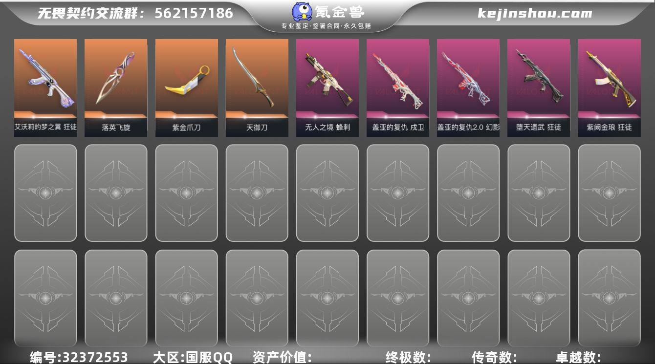 【套装】:离子武器//2.0套装,神中神罚套装 【英雄】:幻棱,炼狱,维斯,暮蝶,钛狐,壹决,捷风,雷兹,不死鸟,贤者,猎枭,蝰蛇,零,芮娜,奇乐,斯凯,夜露,K/O,盖可,黑梦,钢锁 【近战武器】:近战武器-神之刃,近战武器-紫金爪刀,近战武器-落英飞旋,近战武器-离子武器//2.0 爪刀,近战武器-天御刀,近战武器-诡秘蛇影 军刀,近战武器-日耀风暴 遗器,近战武器-阿特拉斯指挥部 甩棍 【狂徒】:狂徒-艾沃莉的梦之翼,狂徒-归零者,狂徒-混沌序曲,狂徒-塑水宗,狂徒-堕天遗武,狂徒-紫阙金琅,狂徒-离子武器//2.0,狂徒-诡秘蛇影 【幻影】:幻影-黯夜怪谈,幻影-盖亚的复仇//2.0,幻影-神中神罚,幻影-末日之翼 【戍卫】:戍卫-盖亚的复仇,戍卫-折光棱晶 【獠犬】:獠犬-星航勇进 【冥驹】:冥驹-虎魄春明 【飞将】:飞将-末日之翼 【莽侠】:莽侠-神中神罚,莽侠-诡秘蛇影 【战神】:战神-离子武器//2.0 【奥丁】:奥丁-末日之翼 【判官】:判官-诡秘蛇影 【骇灵】:骇灵-离子武器//2.0,骇灵-神中神罚 【蜂刺】:蜂刺-无人之境,蜂刺-折光棱晶 【标配】:标配-源能者危机001,标配-折光棱晶 【VCT手枪】:标配-VCT25 x LEV 【正义】:正义-掠影 【鬼魅】:鬼魅...