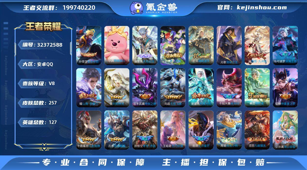 【936493】安卓Q-V9-至尊星耀IV段位-128英雄-325皮肤-1典藏皮肤-2无双-31传说-102史诗 【英雄全皮】:孙权全皮,敖隐全皮,空空儿全皮,影全皮 【荣耀典藏】:伽罗最初的交响 【无双皮肤】:孙悟空无相,曜器灵螭龙剑 【传说皮肤】:阿轲罗刹妄海,云缨神骥越千峰,关羽神骥镇沧海,朵莉亚神骥鸣幻洲,狄仁杰神骥赴朔漠,貂蝉神骥聚万邦,马超神骥逐星野,澜愿照九州拓,云缨幻光神枪,桑启鸣野蒿,项羽无限倾心,后羿无尽星芒,马超无双飞将,孙策挚爱之约,露娜启示之音,孙策末日机甲,瑶时之祈愿,裴擒虎寅虎赤拳,鲁班七号寅虎瑞焰,孙尚香异界灵契,曜李逍遥 ,小乔音你心动,镜炽阳神光,虞姬启明星使,曜云鹰飞将,李信一念神魔,刘备时之恋人,张良黄金白羊座,诸葛亮武陵仙君,宫本武藏地狱之眼,孙悟空地狱火 【限定皮肤】:姜子牙天穹之誓,狄仁杰阴阳师,廉颇寅虎御盾,赵云皇家上将,赵云百木心枪,孙尚香异界灵契,鲁班七号寅虎瑞焰,庄周高山流水,孙膑寅虎展翼,白起夜都怪侠,芈月幻夜卜梦,元歌无心,夏侯惇匿光决锋者,甄姬女儿国国王,典韦岱宗,马可波罗山海玄木吟,狄仁杰魔术师,达摩沙漠行僧,项羽海滩派对,项羽无限倾心,老夫子航海奇遇记,程咬金...