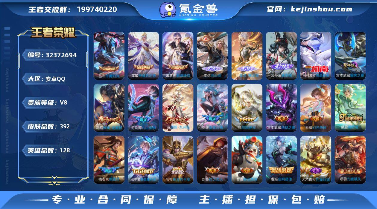 安卓Q-V9-最强王者段位-128英雄-437皮肤-1典藏皮肤-2无双-1珍品传说-38传说-137史诗 【英雄全皮】:达摩全皮,孙权全皮,鬼谷子全皮,黄忠全皮,曜全皮,戈娅全皮,空空儿全皮,影全皮 【荣耀典藏】:李白鸣剑曳影 【无双皮肤】:李白碎月剑心,曜器灵螭龙剑 【珍品传说】:鲁班七号江户川柯南 【传说皮肤】:云缨幻光神枪,嬴政玄雷天君,桑启鸣野蒿,马超琥珀纪元,铠琥珀纪元,澜逐花归海,露娜霜月吟,狄仁杰夜礼服假面,宫本武藏惊梅引,澜电玩雷克斯,干将莫邪画中仙,曜山海苍雷引,李白诗剑行,狄仁杰神器狴犴令,马超无双飞将,女娲补天,孙策末日机甲,裴擒虎寅虎赤拳,鲁班七号寅虎瑞焰,孙尚香异界灵契,曜李逍遥 ,周瑜音你心动,小乔音你心动,诸葛亮时雨天司,镜炽阳神光,虞姬启明星使,曜云鹰飞将,李信一念神魔,刘备时之恋人,干将莫邪久胜战神,虞姬云霓雀翎,达摩黄金狮子座,梦奇胖达荣荣,后羿黄金射手座,孙尚香末日机甲,宫本武藏地狱之眼,孙悟空地狱火,狄仁杰超时空战士 【限定皮肤】:白起狰,姜子牙天穹之誓,李白谪仙醉月,狄仁杰阴阳师,廉颇寅虎御盾,赵云皇家上将,赵云百木心枪,墨子神迹守卫,孙尚香蔷薇恋人,孙尚香异界灵契,鲁班七号寅虎瑞焰,庄周高山流水,高渐离死亡摇滚,钟无艳超时空战士,扁鹊奇幻香踪,白起夜都怪侠,芈月白晶晶,芈月幻夜卜梦,周瑜真爱至上,元歌云间偶戏,元歌无心,夏侯惇朔风刀,甄姬幽恒,甄姬落雪兰心,曹操烛龙,典韦岱宗,马可波罗暗影游猎,狄仁杰魔术师,狄仁杰万华元夜,狄仁杰神器狴犴令,达摩星际陆战队,达摩沙漠行僧,项羽海滩派对,老夫子醍醐杖,老夫子航海奇遇记,关羽冰锋战神,程咬金演武夺筹,韩信飞衡,韩信傲雪梅枪,王昭君午后时光,兰陵王金庭之子,花木兰青春决赛季,亚瑟潮玩骑士王,孙悟空至尊宝,孙悟空孙行者,后...