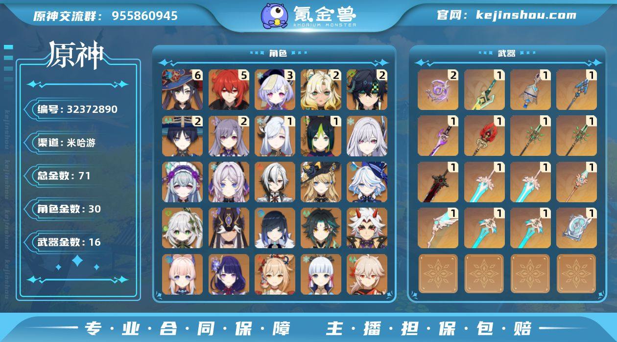 本人自玩五年老号UID11开头充过挺多可换绑手机诚信不找回放心买,二命希诺宁2+1暴击60爆伤233基尼奇一炮无拐三十万起步二命流浪者一命申鹤等近二十多个限定和专武,原石纠缠不多,有绫华皮肤和夜兰皮肤,有很多任务大世界探索没做
