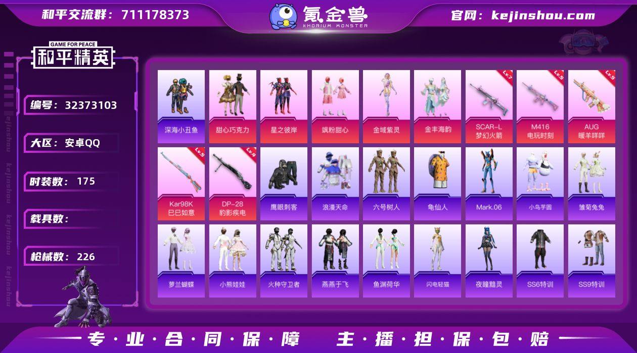 可二次【特价出售/店主推荐】安卓 手Q-5粉装-5特效枪-0载具-2粉色飞行器-72326热力值-2王牌印记-175套装-226枪皮 【热门品类】:套装-浪漫天命,套装-深海小丑鱼,套装-六号树人,套装-龟仙人,角色-Mark.06 【粉色套装】:粉装-甜心巧克力,粉装-星之彼岸,粉装-飒粉甜心,角色-金域紫灵,粉装-金丰海韵 【粉色枪皮等级】:SCAR-L-梦幻火箭(七级),M416-电玩时刻(五级),AUG-暖羊咩咩(五级),Kar98K-巳巳如意(五级),DP-28-豹影疾电(四级) 【粉色枪皮】:SCAR-L-梦幻火箭,M416-电玩时刻,AUG-暖羊咩咩,Kar98K-巳巳如意,DP-28-豹影疾电 【粉色飞行器】:齐天大圣飞行器,桃源时光飞行器 【粉色降落伞】:百万伏特降落伞,未来战士降落伞,梦幻火箭降落伞,四圣焕新降落伞,太空嘟嘟降落伞,彩虹甜喵降落伞,音爆索尼克降落伞,第五大道降落伞,龙珠超降落伞,炫光之旅降落伞,江南烟雨降落伞,霓虹漫游降落伞,忍者神龟降落伞,临安公主降落伞,星穹咏叹调降落伞,幻彩电音降落伞 【稀有套装】:套装-龟仙人,套装-小鸟芋圆,套装-雏菊兔兔,套装-萝兰蝴蝶,套装-小熊娃娃,套装-火种守卫者,套装-燕燕于飞,套装-鱼渊荷华,套装-闪电轻猫,角色-夜瞳黯灵 【稀有枪皮】:AK...