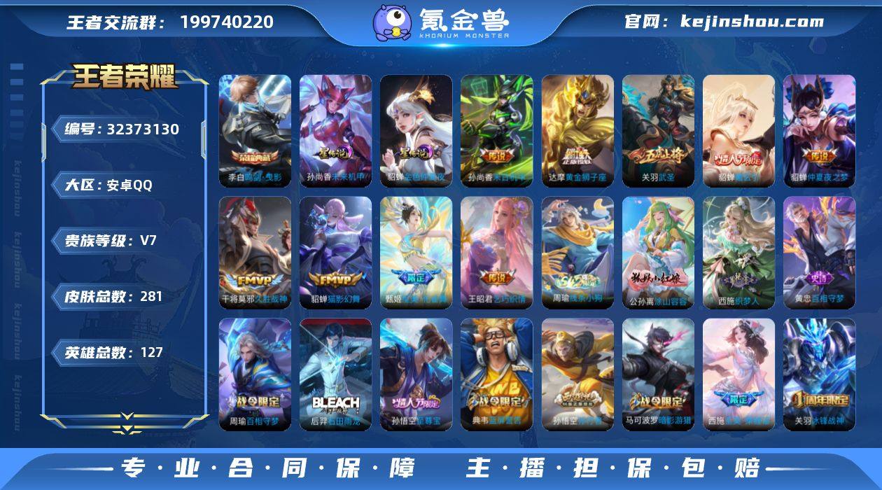 贵族6/皮肤124/典藏2/传说4/史诗42/英雄109/金标敖隐/金标虞姬/影全皮/杀手不太冷/神鉴启示录/未来机甲/酷洛米之心/愿照·众生和/鸣野蒿/绛天战甲/末日机甲-孙尚香/天穹之誓(s36)/阴阳师/皇家上将/魔术师/海滩派对/原初追遂者/李小龙/拒霜思/古海寻踪(s33)/百解令(蒙犽)/龙武盛年/噬灭天穹(s37)/谧流熔炉/虚灵犬护/荣光之誓/九幽镇关/破空之剑/神迹守卫/百相守梦-百里守约/百相守梦-老夫子/茶境仙/访茗客/鸭鸭历险记-刘禅/鸭鸭历险记-沈梦溪/光弋星穹/往忆晖光/线条小狗-周瑜/紫霞仙子/地狱岩魂/鬼剑武藏/水果甜心/暗夜贵公子/摇滚巨星/魅力维加斯/女仆咖啡/金属风暴/幽灵船长/千年之狐/乱世虎臣/水晶猎龙者/乘风破浪/缤纷独角兽/暗隐猎兽者/冰冠公主/曙光守护者/天才门将/功夫厨神/节奏热浪/猫狗日记-孙策/鹰眼统帅/天秀·启明/乐园奇幻夜/永昼/化蝶舞/龙之律动/百相守梦-黄忠/幻珠鲛人/街头霸王/白色死神/西部大镖客(牛魔)/少女阿狸/死亡骑士/拳王/五福同心/龙腾万里/幻想奇妙夜/命运角斗场/功夫老勺/沉稳之力/丁香结/野性能量/黑桃队长/无尽征程/潮玩牛仔/蔚蓝守将/完美运算/暗都幽影/长夏之忆/敬我三分/怪诞之夜/雾都夜雨/逐霄战戟/苍林狼骑/铁骨偃魂/魅影绮裳/雪境奇遇-西施/金福满堂/景韶洛都/玫蓝誓约/春野闲踪/灵野札记/布丁狗之约/命运加冕/潮玩士官长/极光幻客/溯影追猎/苍云破阵/潮流仙人/一千零一夜/万圣前夜/西部大镖客-孙悟空/海军大将/隐刃/特种部队/加勒比小姐/战争骑士/激情绿茵/星航指挥官/伊势巫女/第七人偶/占星师/花间舞/街头旋风/花见巫女/灼热之刃/森/启蛰