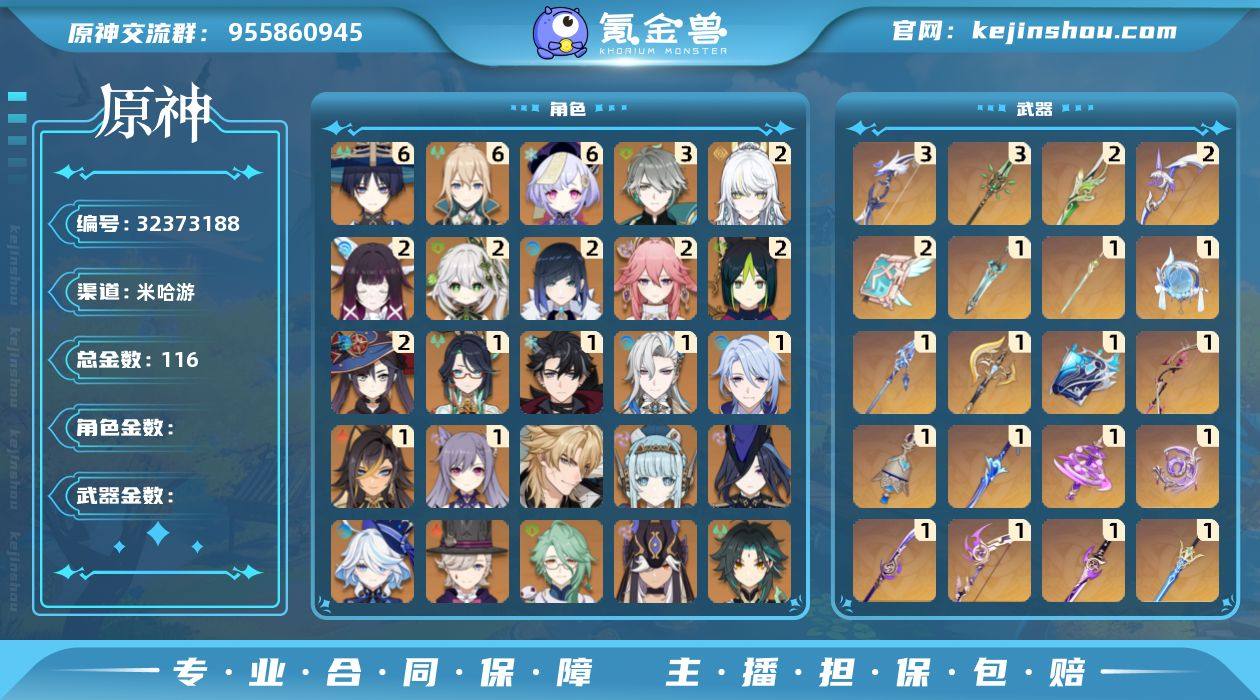 【原神】满命,冒险等级:58,五星数量:68,五星角色:七七 * 6命,琴 * 6命,流浪者 * 6命,艾尔海森 * 3命,哥伦比娅 * 2命,兹白 * 2命,莫娜 * 2命,八重神子 * 2命,夜兰 * 2命,提纳里 * 2命,纳西妲 * 2命,迪希雅 * 1命,那维莱特 * 1命,莱欧斯利 * 1命,闲云 * 1命,刻晴 * 1命,神里绫人 * 1命,珊瑚宫心海,白术,神里绫华,温迪,宵宫,钟离,达达利亚,林尼,阿贝多,芙宁娜,赛诺,伊涅芙,迪卢克,法尔伽,枫原万叶,甘雨,魈,胡桃,克洛琳德,雷电将军__五星武器:和璞鸢 * 3精,若水 * 3精,阿莫斯之弓 * 2精,天空之卷 * 2精,裁叶萃光 * 2精,最初的大魔术,万世流涌大典,裁断,血染荒城,图莱杜拉的回忆,不灭月华,帷间夜曲,苍古自由之誓,朏魄含光,狼的武功歌,飞雷之弦振,风鹰剑,护摩之杖,磐岩结绿,四风原典,天空之傲,天空之刃,雾切之回光,薙草之稻光,冬极白星,神乐之真意,贯虹之槊,波乱月白经津__四星角色:班尼特 * 6命,行秋 * 6命,九条裟罗 * 6命,香菱 * 6命,久岐忍 * 6命,鹿野院平藏 * 6命,珐露珊 * 6命,凝光 * 6命,迪奥娜 * 6命,砂糖 * 6命,绮良良 * 6命,瑶瑶 * 6命,莱依拉 * 6命,坎蒂丝 * 6命,多莉 * 6命,柯莱 * 6命,芭芭拉 * 6命,云堇 * 6命,早柚 * 6命,托马 * 6命,五郎 * 6命,烟绯 * 6命,重云 *...