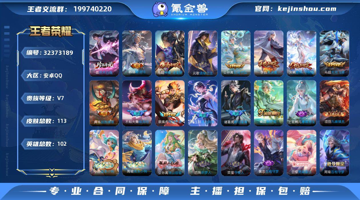 无二次-安卓Q-V7-最强王者段位-102英雄-113皮肤-1珍品传说-13传说-32史诗HZ2631507 【英雄全皮】:孙权全皮 【珍品传说】:暃朽木白哉 【传说皮肤】:韩信踏浪归,马超神骥逐星野,元歌诡秘之主,公孙离云诺千山,杨玉环星之鸣奏,女娲愿照千秋盛,裴擒虎祥瑞亨通,桑启鸣野蒿,典韦战鼓燎原,诸葛亮鹤羽星尊,不知火舞绯月行,马超无双飞将,李白凤求凰 【限定皮肤】:狄仁杰阴阳师,赵云皇家上将,嬴政优雅恋人,芈月白晶晶,元歌云间偶戏,狄仁杰魔术师,项羽海滩派对,程咬金演武夺筹,露娜一生所爱,不知火舞绯月行,钟馗驱傩正仪,干将莫邪冰霜恋舞曲,诸葛亮鹤羽星尊,蒙恬荣光圣徽,鬼谷子天穹祈灯 【年限皮肤】:李白凤求凰,女娲愿照千秋盛 【赛季限定】:程咬金演武夺筹,钟馗驱傩正仪,鬼谷子天穹祈灯,东皇太一噬灭天穹,太乙真人谧流熔炉,钟馗虚灵犬护,甄姬逆浪荇歌,亚瑟荣光之誓,蒙恬荣光圣徽,项羽九幽镇关 【战令限定】:元歌云间偶戏,周瑜百相守梦,孙策百相守梦,周瑜线条小狗,小乔线条小狗 【史诗皮肤】:上官婉儿春霖将至,周瑜线条小狗,小乔线条小狗,项羽九幽镇关,公孙离涂山容容,弈星守夜人,西施织梦人,黄忠百相守梦,云缨赞萌露比,周瑜...