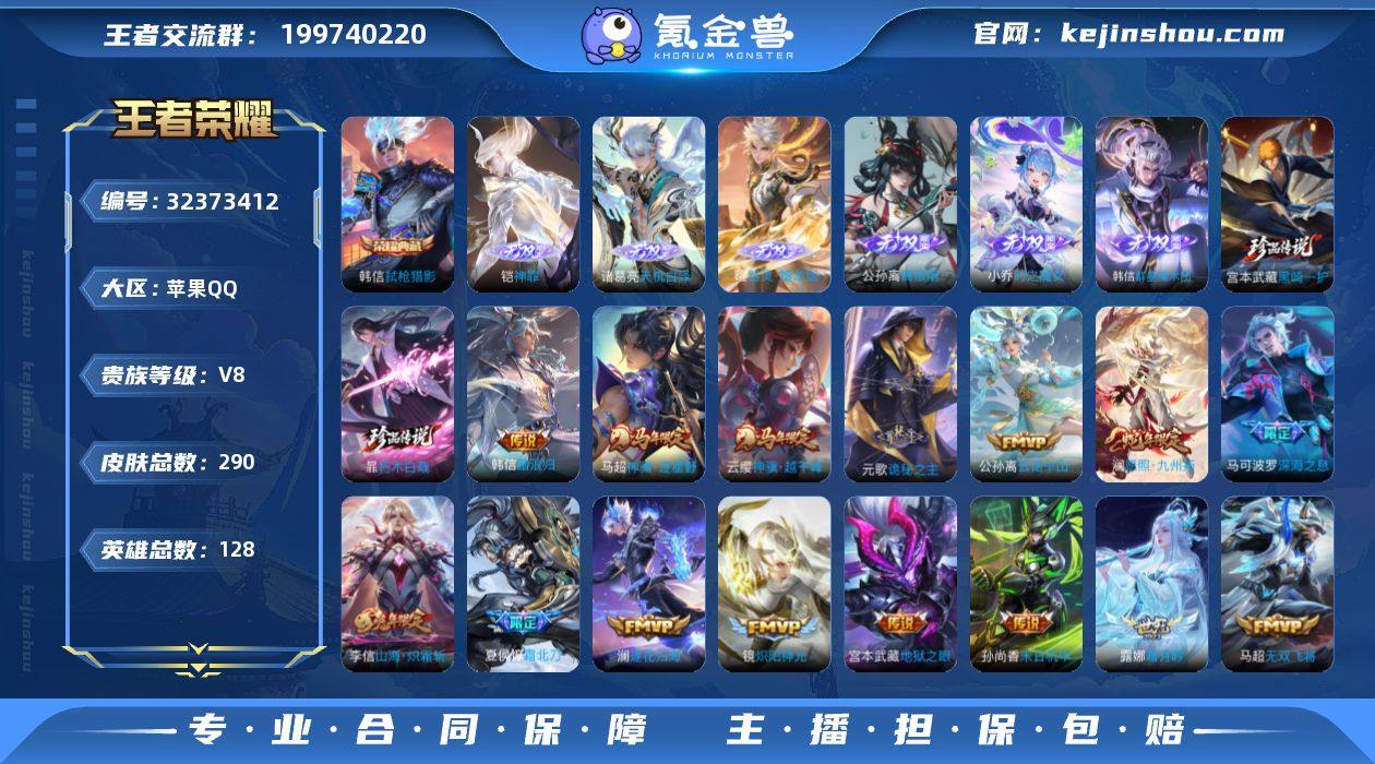 V8 1典藏 3无双 22传说 126英雄 201皮肤 可修改实名 【英雄全皮】:李信全皮 【稀有英雄】:大司命,嬴政(始皇帝),韩信(韩跳跳),夏洛特(夏师傅),艾琳,橘右京(橘子),娜可露露(鸟人),不知火舞,赵云,金蝉(唐僧),戈娅 【荣耀水晶】:弑枪猎影(韩信典藏) 【无双皮】:离恨烟(公孙离无双),韩信群星魔术团(韩信无双),青丘·九尾(妲己无双) 【传说皮】:游龙清影(小青龙),山海·炽霜斩(李信年限),山海·琳琅生(小乔年限),黄金射手座,仲夏夜之梦(大飞蛾),一念神魔,淬星耀世,冠军飞将,久胜战神,云鹰飞将(小将军),炽阳神光,无双飞将,胖达荣荣,山海·苍雷引(电光曜子),燃星之曲,画中仙,浮生妄,记忆之芯(机甲兔),青丘·九尾,百相守梦(张飞) 【珍宝阁皮】:妄想食味 【赛季/战令皮】:古海寻踪(s33),星界游侠,海盐诗旅(s30),擒涛扼浪(s31),潮玩骑兵,奇幻香踪,探海日志(s32),玲珑珍味,剑破天穹(s35),天穹祈灯(s34),青焰无极,苍威无极,暖冬·兔眠,御霄(s14),御銮(s16),疑决卦(s19),原初探秘者(s21),驱傩正仪(s24),猎兽之王,白昼王子,大漠名商(s28),云中旅人(s29),超时空战士-钟无艳,落雪兰心 【史诗皮】:紫霞仙子,苍穹之光,白龙吟,黄金分割率,特工魅影,百解令(蒙犽),龙骑士(小龙虾),偶像歌手,晚萤,无限星赏官,百相守梦(刘备),百相守梦(关羽),银翎春语,乱世虎臣,节奏热浪,修罗,摇滚巨星,水果甜心,绅士熊喵,天才门将,星夜王子,德古拉伯爵,暗隐猎兽者,幽灵船长,鬼剑武藏,诗语江南,拒霜思,缤纷独角兽,乘风破浪,水晶猎龙者,曙光守护者,金属风暴,圣诞狂欢,圣诞恋歌,鹰眼统帅,暗夜贵公子,魅力维加斯,赏金猎手,奇遇舞章,无心,玫瑰异探 【限定皮】:至尊宝,绯月行,山海·碧波行(瑶年限),至美·乘鲤谣,齐天大圣,五谷丰年,梁祝,天狼狩猎者,李小龙,冰霜恋舞曲,云端筑梦师,神器·万象笔,山海·玄木吟(马可年限) 【普通皮】:熔金海岸,劲辣红锅,街头霸王