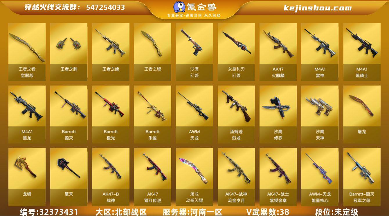 河南一区-39V-5王者武器数-0炫金武器数 【热门武器】:M4A1-黑骑士,汤姆逊-烈龙*3,加特林-炼狱,沙鹰-修罗*3,高爆手雷-幻兽 【王者炫金武器】:王者之魄,王者之刺,王者之锋*2 【皮肤】:毁灭-冠军之怒,战神-紫绶金章皮肤*4,战神-流金岁月皮肤*4,天龙-能量核心,天神-暗月 【角色】:潘多拉-X,潘多拉-甜心教官,潜龙队-X,新娜塔莎 【人偶武器】:生化手雷-机甲核心,闪光弹-小乔,灵狐娃娃手雷 【英雄级武器】:AK47-火麒麟,M4A1-黑龙,M4A1-雷神*2,M4A1-黑骑士,AK-47-猩红传说*7,AK47-B-战神,AWM-天龙,Barrett-毁灭*2,Barrett-极光,Barrett-朱雀,王者之力-觉醒版,加特林-炼狱,汤姆逊-烈龙*3,沙鹰-修罗*3,沙鹰-天神*2,沙鹰-幻兽,屠龙*2,龙啸,擎天,女皇利刃-幻兽,高爆手雷-幻兽,闪光弹-幻兽,烟雾弹-幻兽 【道具】:CFS限定背包,战舰背包,炫彩背包,超级背包,绿色巨人,灵魂忍者,迷雾幽灵,生化弹匣,夺命之镰,防化服*2,枪王排位28赛季金色流光,EP战队名片,EP战队喷图,防弹头盔*2,防弹衣*2,C4工具钳*2,手雷包*2 【特殊枪械】:1黑骑士,3烈龙,1炼狱