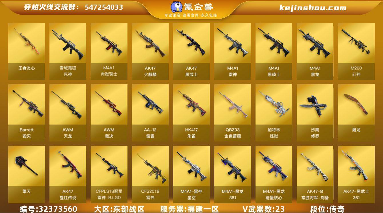 【ky5426】福建一区-26V-1王者武器数-0炫金武器数 【热门武器】:QBZ03-金色蔷薇,HK417-朱雀,M200-幻神,死亡之眼*2,王者炎心,M4A1-黑骑士,加特林-炼狱,沙鹰-修罗 【王者炫金武器】:王者炎心 【音效卡】:AK47-火麒麟音效卡,Barrett-毁灭音效卡,死神-雪域霜狐-怀旧音效卡 【皮肤】:幻神-AG-CFPL S24冠军 皮肤,QBZ03-AG-CFPLS19冠军,裁决-巅峰荣耀 皮肤,烈龙-星空,雷神-星空,M4A1-雷神-CFS 2019,雷神-R.LGD-CFPLS18冠军,火麒麟-巅峰荣耀,毁灭-荣耀之怒*2,毁灭-星空,黑龙-能量核心,M4A1-黑龙-361,AK47-黑武士-361,AK47-B-常胜将军-刘备,AWM-天龙-传奇白鲨*2,屠龙-荣耀之锋,龙啸-巅峰荣耀 皮肤*2 【角色】:魅影,战地猎狐,雪域霜狐,乔伊教练,疾风,娟娟,兰-海滩派对,麻雀,娜塔莉娅,斯沃特-X,蜀雪,兔囡囡,雅典娜,海豹突击队 【人偶武器】:迷你深渊冰龙 【暴走生化】:死亡之眼*2,超级对讲机 【挑战大师】:神圣爆裂者III 【英雄级武器】:AK47-火麒麟,M4A1-黑龙,M4A1-雷神,M4A1-黑骑士,AK47-黑武士,HK417-朱雀,死神-雪域霜狐,QBZ03-金色蔷薇,AK-47-猩红传说,AWM-天龙,Barrett-毁灭,AWM-裁决,M200-幻神,加特林-炼狱,AA-12-...
