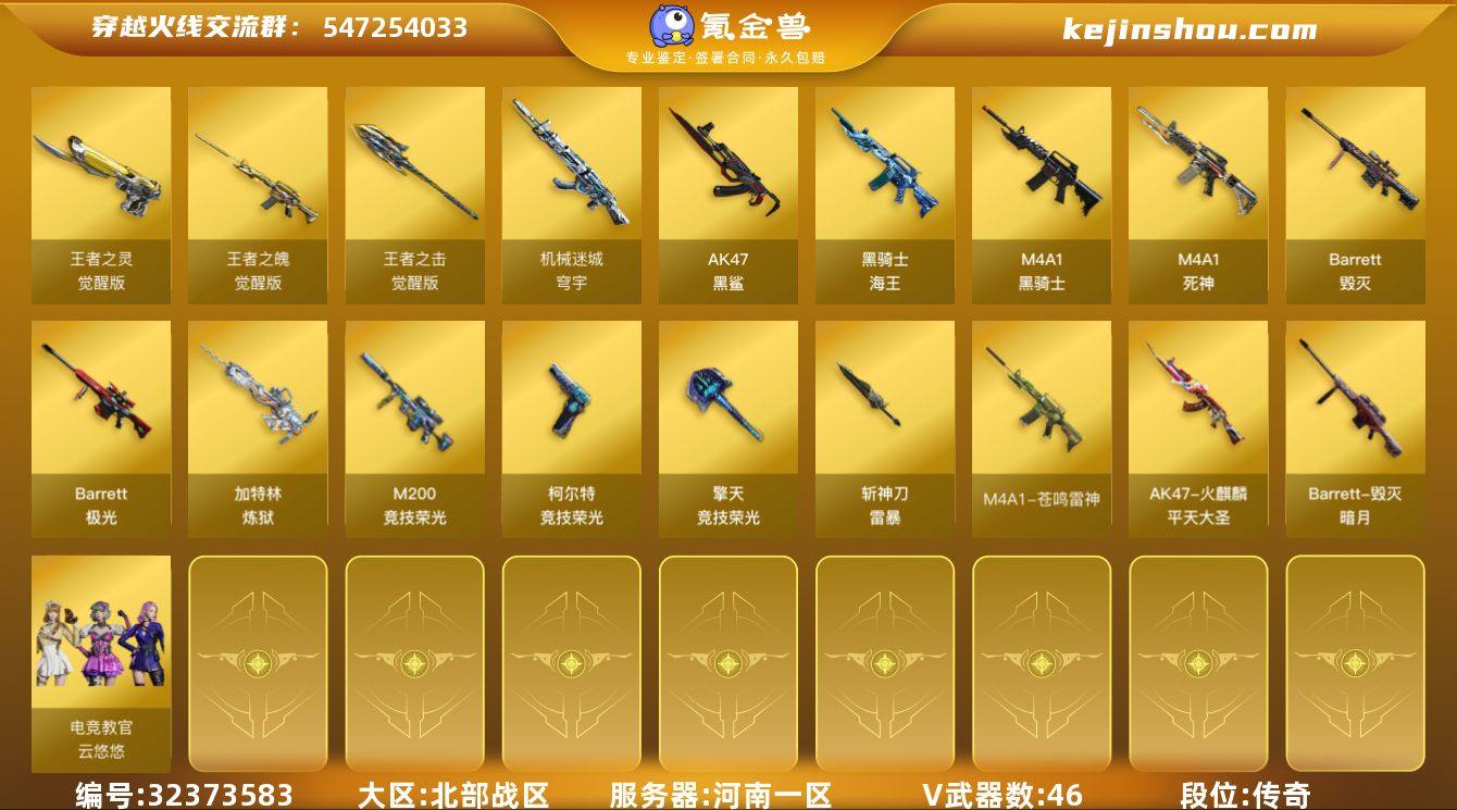 【ky6217】河南一区-54V-3王者武器数-0炫金武器数 【热门武器】:M200-竞技荣光,M4A1-黑骑士,加特林-炼狱,雷神-小红,裁决-雪莉杨,USP-雷暴 【皮肤】:火麒麟-平天大圣,毁灭-暗月,毁灭-神秘黑洞皮肤,毁灭-英雄计划 皮肤,极光-能量核心,轻型军用手斧-再燃火线 【角色】:电竞教官-云悠悠,乔伊教练,修道士,云海玲珑,葵-阿尔法武装,幻面灵狐,暗夜-X,初恋灵狐,灵狐者-七夕宝贝,龙儿-小淘气,潘多拉-甜心教官,斯沃特-X,铁骑荣耀 【人偶武器】:雷神-小红,裁决-雪莉杨,夺魂,生化手雷-机甲核心 【挑战大师】:冰龙粉碎者-白马银枪,激光毁灭者III,阐释者III 【英雄级武器】:M4A1-黑骑士,M4A1-死神*2,AK47-黑鲨,王者之魄-觉醒版,黑骑士-海王,HK417-朱雀-电竞之星,机械迷城-穹宇,Barrett-毁灭,Barrett-极光,M200-竞技荣光,加特林-炼狱,USP-雷暴,柯尔特-竞技荣光,王者之灵-觉醒版,擎天-竞技荣光,斩神刀-雷暴,王者之击-觉醒版,高爆手雷-雷暴,高爆手雷-竞技荣光*8,闪光弹-雷暴,闪光弹-竞技荣光*10,烟雾弹-雷暴,烟雾弹-竞技荣光*7,M4A1-苍鸣雷神 【道具】:云山科技背包,亚洲杯纪念炫彩背包,战舰背包,炫彩背包,女皇终结者-魔龙之吻,...
