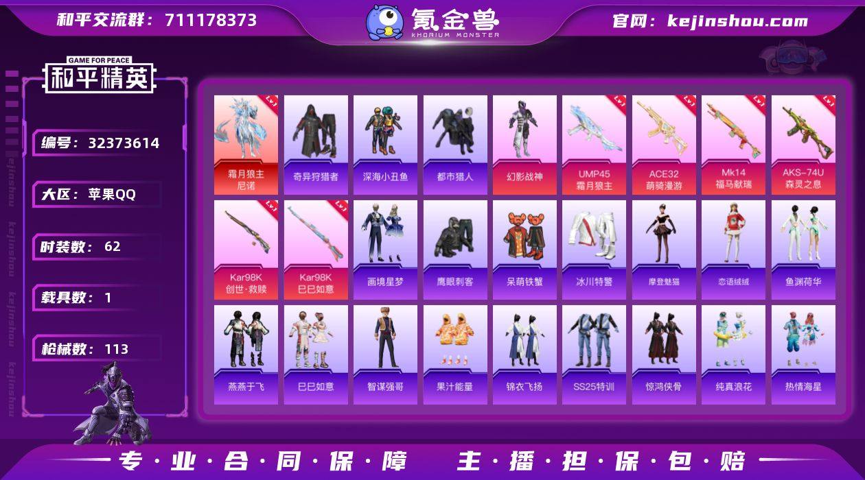 M1046928【身法号1载具-1神装-2粉装-6特效枪 霜月冰狼 霜月狼主-尼诺[1级]UMP45-霜月狼主[1级]深海小丑鱼 都市猎人 奇异狩猎者 M416-黄金龙骨 AWM-黄金龙骨】无二次包苹果手Q-1载具-1神装-2粉装-6特效枪-62套装-113枪皮-0王牌印记-荣耀皇冠Ⅳ-32968热力值【1载具】霜月冰狼【1神装】霜月狼主-尼诺[1级]【2粉装】幻影战神 角色-冷漠罗丽【6特效枪】UMP45-霜月狼主[1级] Mk14-福马献瑞[5级] Kar98K-创世·救赎[6级] Kar98K-巳巳如意[5级] AKS-74U-森灵之息[5级] ACE32-萌骑漫游[4级]【7稀有】深海小丑鱼 都市猎人 奇异狩猎者 M416-黄金龙骨 AWM-黄金龙骨 M762-奇异狩猎者 AKM-缤纷海域【5飞行器】冠军兔兔飞行器 马上有福飞行器 招财竹蜻蜓飞行器 冰狼掠影飞行器 破刃行动尾迹【3头盔】幻影战神头盔 金羽特工头盔 深海小丑鱼头盔【3背包】百万伏特背包 金羽特工背包 幻影战神背包【159其它衣服和枪皮】超能勇士 漫步者 呆萌铁蟹 街头潮人 果汁能量 SS28特训 海盐绵绵冰 角色-摩登魅猫 长空猛禽 福马献瑞 SS33特训 纯真浪花 角色-绯影武装 热情海星 白色伏地魔 蓝调潮人 SS32特训 琴音绮想 狙击之神 街头风暴 冰冻风暴 SS34特训 阳光火鸡 巳巳如意 竞技名士 恋语绒绒 鹰眼刺客 惊鸿...