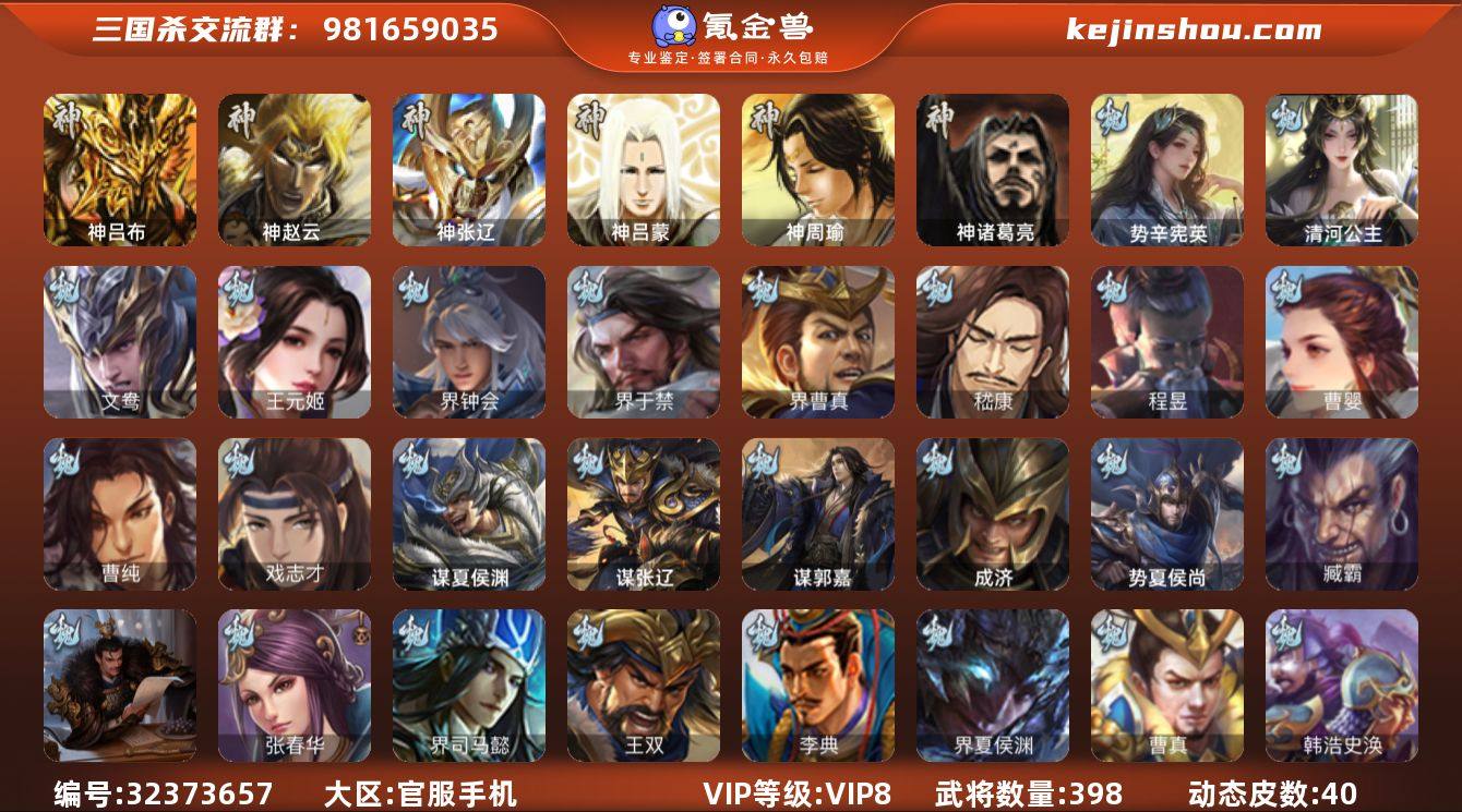 【14789579】官阶:大将军;VIP等级:VIP8;史诗武将数量:47;动态皮肤数量:40;武将总数:398;史诗宝珠数量:0;将魂数量:9986;神将:4;魏国史诗武将:22;蜀国史诗武将:11;吴国史诗武将:8;群史诗武将:16