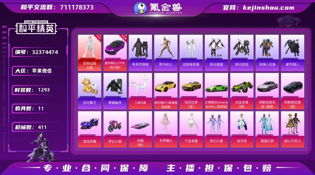 实名:可二次实名 是否支持人脸包赔:支持 粉装数量:65 特效枪数量:40 载具数:9 时装数:1140 枪械数:409 火箭少女101,奇异狩猎者,派对舞王,胖达圆圆,深海小丑鱼 六级迈凯伦570S(镭射紫),六级路特斯ELETRE(电光紫),五级玛莎拉蒂Quattroporte(幻星粉),五级宾利欧陆GT敞篷(深空蓝) 暗夜鎏金,暗夜玫瑰,宝贝奶油派,冰川红玫,冰川幽秘,缤纷油彩,百合蜜语,薄荷物语,冰霜白皇,白勺歌姬,彩虹鹿灵,彩虹甜喵,炙焰红王,纯珍童话,呆萌星弥,第五大道,蝶舞迷情,独舞天鹅,复仇流浪者,放客神游,怪诞乔克,歌者泠鸢,寒光使者,海螺星光,黄伞悠悠,金属狂野,橘柚倾心,极致幻想,琉璃脉冲,冷漠罗丽,蓝莓炮弹,洛天依,烈焰拳霸,梦幻火箭,茉莉星,蜜桃特工,蜜语绒猫,千金淑猫,青空秋雨,绮梦青鸾,启明星,枪炮玫瑰,蔷薇星,飒粉甜心,山涧鹿灵,天使彩虹糖,水仙星,天禅智恒,童趣迷兔,甜心巧克力,天星战神,未来歌姬,王牌四分卫,馨动时刻,雪国幻梦,小可学妹,香水柠檬,新星烈龙,星夜魔法师,星之彼岸,旋转彩虹,音爆索尼克,吟月归客,智耀战神,猪猪侠 九级AKM-盖世英雄,九级M416-超新星,七级M762-甜蜜誓约,六级燃烧瓶-薄荷可可,六级AKS-74U-信仰神谕,六级AUG-星之彼岸,六级Groza-香水柠檬,六级P90-沙丘之主,六级破片手榴弹-热量炸弹,六级SCAR-L-天蓬元帅,六级UMP45-相思残雪,五级DP-28-豹影疾电,五级AMR-炫光之旅,五级GROZA-镜光银凌,五级Kar98K-巳巳如意,五级MG-36-幻彩电音,五级MK14-甜梦熊击,五级UZI-畅跳缤纷,四级AWM-橘柚倾心,四级DP-28-金蝉行者,四级M249-蓝莓炮弹,四级M417-第五大道,四级MG3-洛神天依,四级MK20-H-海螺星光,四级PKM-天星战神,四级汤姆逊-冰川粉黛,四级Vector-飒粉甜心,四级烟雾弹-丁香清露,三级Kar98K-未来歌姬,三级M24-魔法神域,一级AKM-梦之光华,一级AKM-甜心宝贝,一级DP-28-暗夜鎏金,一级DP-28-扶摇飞仙,一级GROZA-旋转彩虹,一级M416-心之恋语,一级P90-仙履奇缘,一级SCAR-L-青春物语,一级汤姆逊-怪笑疯兔,一级VSS-烈焰拳霸 一级快艇-自由的鲸,合金龙骨(红),鬼马风驰,双人摩托-梦幻火箭,星梦玉骢 狙击之神,马上来财,暖暖麦兜,红釉青花,SS37特训,雨过天青,碧青流霞,阳光菠萝,雪国风尚,画境星梦,琴音绮想,SS36特训,火箭少女101,奇异狩猎者,炫彩糖果,萌鸡速递,风迹短诗,SS35特训,午间小调,甜心蒙太奇,元气之梦,懒羊羊,美羊羊,绿野邂逅,狂鲨锋刃,凌霄紫焰,擎苍青焰,SS34特训套装,朱霞炽焰,2B战斗服款,暗黑裁决,暗金炫舞,暗影哥特,暗影爵士,暗夜傀儡,暗夜魅影,暗夜契约,碧波幻想,冰川特警,缤纷果语,缤纷焰火,滨海厨神,滨海假日,冰河战士,白兰地假日,爆裂葡萄,冰爽风暴,冰爽海盐,白熊同盟,本愿之火,纯白誓言,岑岑玉浪,彩虹兔,彩虹嘻嘻猴,长空猛禽,潮流游乐家,春日漫步,春野茶蘼,顶瓜瓜,大橘大利,大橘为重,呆萌铁蟹,电音精灵,风暴特警,飞驰魅影,绯格组合,粉红小猪,粉恋花,粉团憨憨,福星高照,飞行日记,格斗先锋,瑰梦爱神,诡面顽熊,光矢逐梦,怪笑疯兔,龟仙人,光之冒险,幻彩翩翩,鹤鸣,虎虎生威吉莉,活力清阳,湖蓝色名流,和平特警,荷畔雨呱,黑色伏地魔,灰色格斗者,黄色名流,幻世战舞者,和煦暖阳,红熊茄茄,辉星之火,绝对偶像,极地朋