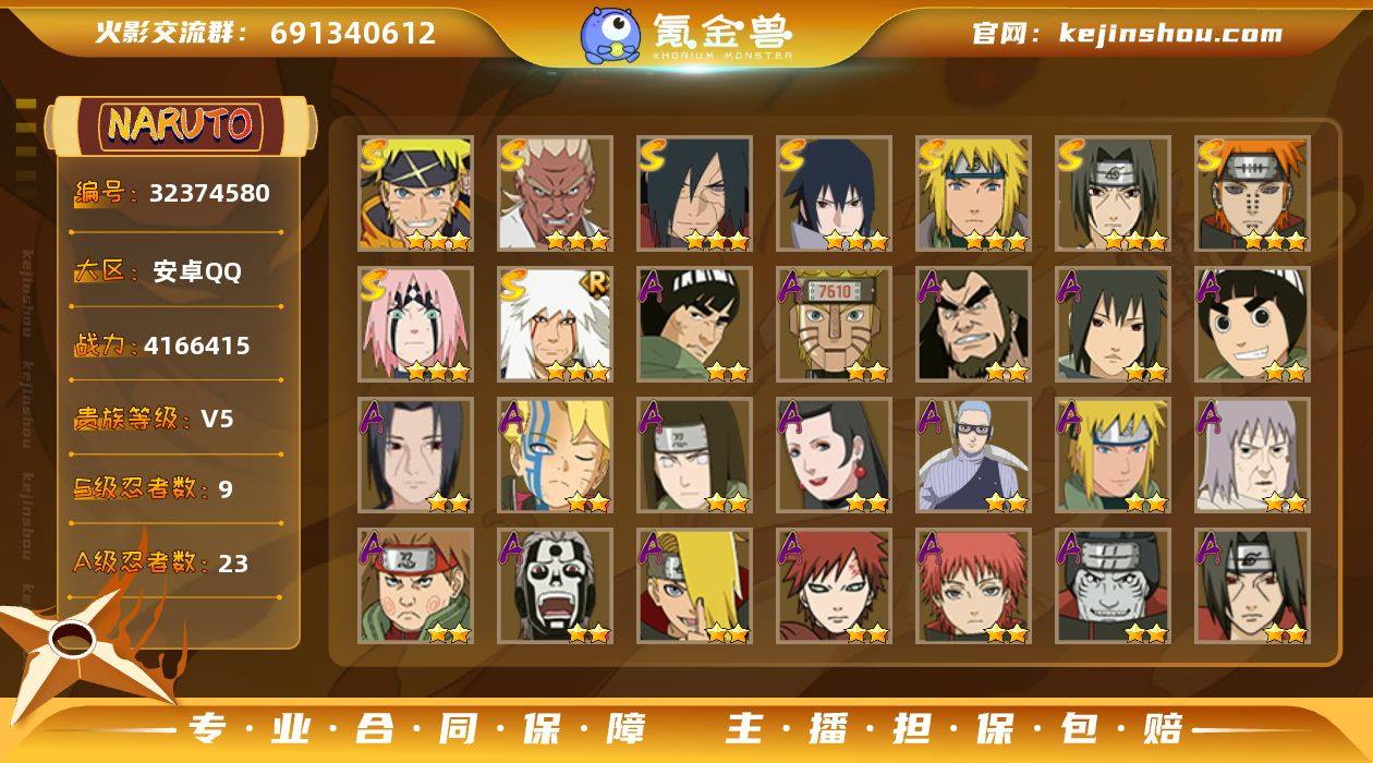 9S忍/23A忍/战力416W/V5/区服3508 【S忍者】 宇智波佐助「漩涡鸣人」,艾「忍界大战」,宇智波斑「秽土转生·解」,宇智波佐助「永恒万花筒」,春野樱「忍界大战」,自来也「舞之豪杰」,宇智波鼬「须佐能乎」,佩恩「天道」,波风水门, 【A忍者】 机械鸣人「初始形态」,迈特凯「青春爆炸」,长十郎「六代目水影」,不缘,日向宁次「忍界大战」,漩涡博人「桃式显现」,宇智波鼬「夏日限定」,李洛克「忍界大战」,宇智波泉奈,神农「羁绊」,波风水门「青年」,千代「近松十人卫」,秋道丁次「忍界大战」,飞段「死司凭血」,迪达拉,我爱罗「疾风传」,蝎,干柿鬼鲛,宇智波鼬,猿飞阿斯玛,迈特凯,桃地再不斩, PX_2503662