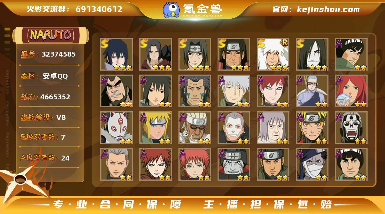 7S忍/24A忍/战力466W/V8/区服1722 【S忍者】 宇智波佐助「漩涡鸣人」,宇智波佐助「永恒万花筒」,千手柱间「秽土转生」,自来也「舞之豪杰」,宇智波鼬「秽土转生」,宇智波鼬「须佐能乎」,大蛇丸, 【A忍者】 机械鸣人「初始形态」,迈特凯「青春爆炸」,长十郎「六代目水影」,我爱罗「新春限定」,旗木卡卡西「幻之真容」,不动,宇智波泉奈,神农「羁绊」,不风,神秘面具男「忍者之路」,波风水门「青年」,奇拉比「忍界大战」,飞段「恶灵之影」,千代「近松十人卫」,漩涡鸣人「仙人模式」,飞段「死司凭血」,飞段,我爱罗「疾风传」,蝎,干柿鬼鲛,猿飞阿斯玛,迈特凯,桃地再不斩, PX_2506160