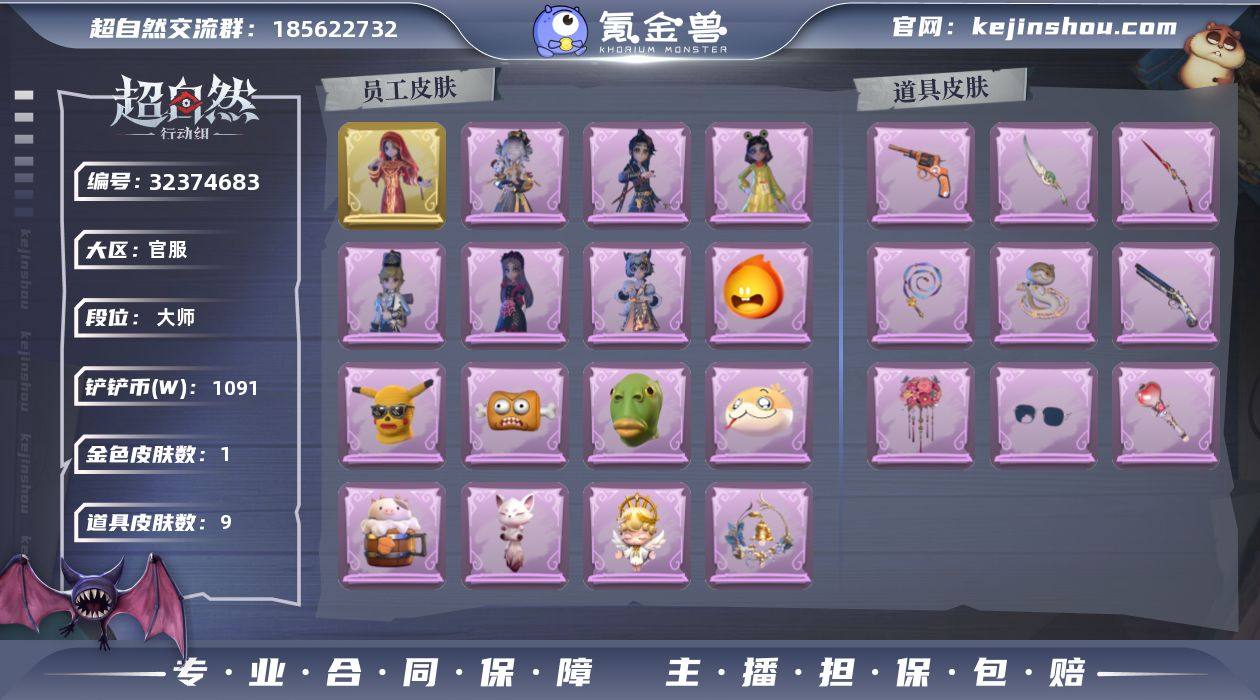 双字ID 粉皮1;紫皮7;道具皮10;皮肤:小黄-炽天使,莉莉-莓果陷阱,莉莉-除妖小师妹,艾伦-黎明猎手,阿念-庆宴绮愿,爱丽丝-耀眼的你,爱丽丝-甜梦派对,小黄-异色序曲;道具:音响-鸣沙鼓,夜视仪-金丝眼镜,音响-happy猫,闪光弹-金戈玄铜,长枪-罪棘,长鞭-缚誓之锁,葫芦-伏妖塔,急救包-蔷薇物语,刺刀-铂刺与红萼,腰包-宝剑八;美妆:美妆-暗夜小恶魔;饰品:头饰-烈焰红唇头套,头饰-萨卡班甲鱼头套,头饰-樱桃奶油布丁,头饰-嘻嘻头套,头饰-大葱明头套,头饰-烛光纪念,头饰-火爆了头套,头饰-惊魂南瓜头套,头饰-呆滞头套,头饰-马上有钱,头饰-饺饺者头套,头饰-太空鲨头套,头饰-面具马头套,头饰-哈士奇头套,头饰-雪墩墩头套,头饰-滑稽头套,头饰-卑微头套,头饰-鱼头怪头套,头饰-蒜了八,头饰-像素朋克墨镜,头饰-后室幸存者头套,挂饰-尘封旧事,挂饰-糖果守卫,背饰-醉花阴,背饰-牛啤背包,背饰-梵音莲华,背饰-蝶恋花;动作:动作-舞台中心,动作-新年摇,动作-姬芽摇,动作-鹏友摇,动作-luvaboy,动作-拜年,动作-带你逃跑吧,动作-要糖,动作-举牌,动作-蝴蝶步,动作-抬手;工牌背景:工牌背景-珊瑚海,工牌背景-甜酷指令,工牌背景-圣光之誓,工牌背景-蓝海奇遇,工牌背景-鸢尾花,工牌背景-春和景明;工牌动作:工牌动作-虔诚之姿,工牌动作-鸦影;员工:爱德华,员工-爱丽丝,员工-艾伦,员工-兰,员工-小黄,员工-零,员工-莉莉,员工-临云,员工-小满,员工-巫铃儿,员工-薇薇安,员工-逍遥,员工-阿念;累充431元;铲铲币4.9万;金砖18;段位:超自然传说46;魔盒等级:6
