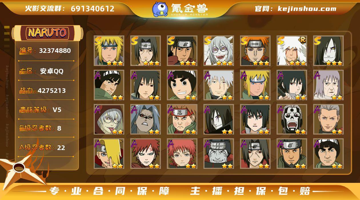 8S忍/22A忍/战力427W/V5/区服2807 【S忍者】 宇智波佐助「漩涡鸣人」,自来也「舞之豪杰」,药师兜「仙人模式」,千手柱间,宇智波鼬「须佐能乎」,佩恩「天道」,波风水门,大蛇丸, 【A忍者】 小南「神驹佑将」,迈特凯「青春爆炸」,旗木卡卡西「幻之真容」,李洛克「忍界大战」,宇智波泉奈,波风水门「青年」,宇智波佐助「须佐能乎」,千代「近松十人卫」,药师兜「半蛇斗篷」,宇智波佐助「疾风传咒印」,秋道丁次「忍界大战」,大蛇丸「晓」,宇智波佐助「万花筒写轮眼」,飞段「死司凭血」,飞段,迪达拉,我爱罗「疾风传」,蝎,干柿鬼鲛,宇智波鼬,猿飞阿斯玛,迈特凯, PX_2504162