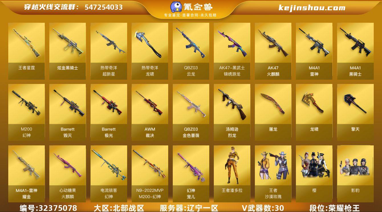 辽宁一区-35V-2王者-1炫金 【热门武器】:QBZ03-金色蔷薇,M200-幻神,死亡之眼*2,C.A.T,M4A1-黑骑士,汤姆逊-烈龙 【王者炫金武器】:王者星霆,炫金骑士 【音效卡】:M4A1-雷神音效卡,M4A1-黑骑士音效卡 【皮肤】:幻神-宠儿-2021MVP,M200-幻神-N9-2022MVP,幻神-电流骇客 皮肤,幻神-电竞之星 皮肤,裁决-运输船 皮肤,雷神-耀金皮肤,火麒麟-心动糖果,毁灭-英雄计划 皮肤 【角色】:樱,影豹,电竞教官-云悠悠,隼,王者潘多拉,王者沙漠玫瑰,奇洋探员,暗夜-X,飞虎队-X,兰妹妹,灵狐者-黄金海岸,潘多拉-X,潘多拉-甜心教官,斯沃特-X,兔囡囡,维纳斯,幽,游珑儿 【人偶武器】:C.A.T,巴雷特-赏金猎人 【暴走生化】:死亡之眼*2 【挑战大师】:阐释者III 【英雄级武器】:AK47-火麒麟,M4A1-雷神,M4A1-黑骑士,QBZ03-云龙,黑武士-锦绣游龙,超新星-热带奇洋,QBZ03-金色蔷薇,Barrett-毁灭,Barrett-极光,AWM-裁决,M200-幻神,汤姆逊-烈龙,屠龙,龙啸,擎天,龙啸-热带奇洋,高爆手雷-幻灵*3,手雷-热带奇洋,闪光弹-雷霆,闪光弹-雷暴,闪光弹-幻灵*2,闪光弹-竞技荣光,闪光弹-云龙,烟雾弹-幻灵*2,烟雾弹-竞技荣光,烟雾弹-云龙 【道具】:BS战队炫...