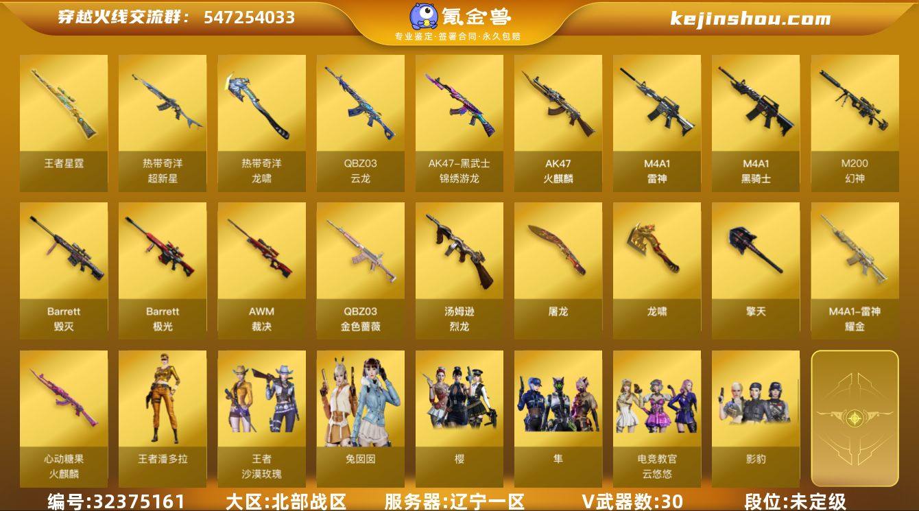 辽宁一区-35V-2王者-1炫金 【热门武器】:QBZ03-金色蔷薇,M200-幻神,死亡之眼*2,C.A.T,M4A1-黑骑士,汤姆逊-烈龙 【王者炫金武器】:王者星霆,炫金骑士 【音效卡】:M4A1-雷神音效卡,M4A1-黑骑士音效卡 【皮肤】:幻神-宠儿-2021MVP,M200-幻神-N9-2022MVP,幻神-电流骇客 皮肤,幻神-电竞之星 皮肤,裁决-运输船 皮肤,雷神-耀金皮肤,火麒麟-心动糖果,毁灭-英雄计划 皮肤 【角色】:樱,影豹,电竞教官-云悠悠,隼,王者潘多拉,王者沙漠玫瑰,奇洋探员,暗夜-X,飞虎队-X,兰妹妹,灵狐者-黄金海岸,潘多拉-X,潘多拉-甜心教官,斯沃特-X,兔囡囡,维纳斯,幽,游珑儿 【人偶武器】:C.A.T,巴雷特-赏金猎人 【暴走生化】:死亡之眼*2 【挑战大师】:阐释者III 【英雄级武器】:AK47-火麒麟,M4A1-雷神,M4A1-黑骑士,QBZ03-云龙,黑武士-锦绣游龙,超新星-热带奇洋,QBZ03-金色蔷薇,Barrett-毁灭,Barrett-极光,AWM-裁决,M200-幻神,汤姆逊-烈龙,屠龙,龙啸,擎天,龙啸-热带奇洋,高爆手雷-幻灵*3,手雷-热带奇洋,闪光弹-雷霆,闪光弹-雷暴,闪光弹-幻灵*2,闪光弹-竞技荣光,闪光弹-云龙,烟雾弹-幻灵*2,烟雾弹-竞技荣光,烟雾弹-云龙 【道具】:BS战队炫...