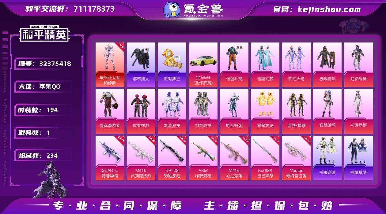 苹果【极品男神号 最终圣卫者-帕修斯(四级),粉装-怪诞乔克,粉装-雪国幻梦,粉装-梦幻火箭,套装-暗影哥特,套装-都市猎人,套装-派对舞王,粉装-放客神游,SCAR-L-青春物语(七级),M416-心之恋语(五级),M416-灵猫魔法师(六级),宝马M4(圣保罗黄)】 手Q-无敌战神框-1神装-14粉装-11特效枪-1载具-4粉色飞行器-83544热力值-18王牌印记-194套装-234枪皮 【红色神装等级】:最终圣卫者-帕修斯(四级) 【红色角色神装】:最终圣卫者-帕修斯 【热门品类】:粉装-怪诞乔克,粉装-雪国幻梦,粉装-梦幻火箭,套装-浪漫天命,套装-都市猎人,套装-派对舞王,套装-小丑鱼,套装-龟仙人,套装-暗影哥特 【粉色套装】:粉装-极限特训,粉装-幻影战神,粉装-星际漫游者,粉装-怪诞乔克,粉装-雪国幻梦,粉装-梦幻火箭,粉装-放客神游,粉装-新星烈龙,粉装-绚金战神,粉装-吟月归客,粉装-傲傲奶龙,套装-创世·救赎,角色-狂魅哈莉,角色-冷漠罗丽 【粉色枪皮等级】:AKM-绿萝繁花(五级),SCAR-L-青春物语(七级),M416-心之恋语(五级),M416-灵猫魔法师(六级),ACE32-萌骑漫游(一级),Vector-最终圣卫者(三级),AKS-74U-森灵之息(五级),Kar98K-巳巳如意(五级),Mk14-福马献瑞(五级),DP-...