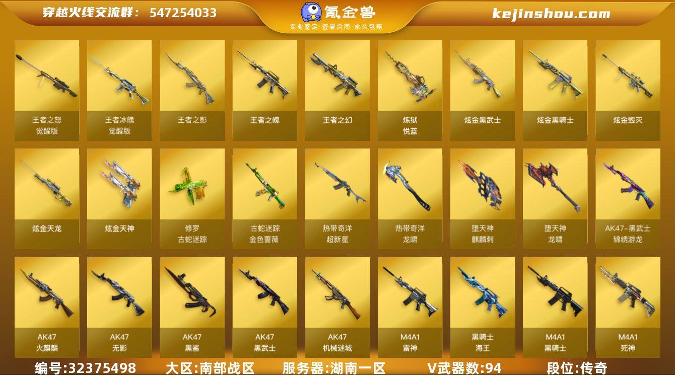 湖南一区-93V-6王者武器数-6炫金武器数 【热门武器】:QBZ03-金色蔷薇*2,M14EBR-玄武,金色蔷薇-古蛇迷踪,修罗-古蛇迷踪,M200-竞技荣光,死亡之眼*2,M4A1-黑骑士*3,汤姆逊-烈龙*5,RPK-盘龙,加特林-炼狱,沙鹰-修罗*2 【王者炫金武器】:王者之幻,王者之影,王者之魄,炼狱-悦蓝,炫金骑士*2,炫金武士,炫金毁灭,炫金天龙,炫金天神 【音效卡】:M4A1-黑骑士音效卡,Barrett-毁灭音效卡 【皮肤】:雷神-能量核心*2,雷神-星空,雷神-源计划2.0专属 皮肤,黑龙-能量核心,黑龙-暗月*2,黑骑士-暗月*3,无影-暗月*4,无影-能量核心,死神-秘银*3,天启-暗月*7,战神-粉色甜心皮肤,战神-紫绶金章皮肤,战神-流金岁月皮肤*4,天龙-秘银*5,天龙-能量核心,修罗-能量核心,天神-暗月*2 【角色】:葵,王者-零,蛇隐宗,奇洋探员,乔伊教练,修道士,云海玲珑,暗夜-X,飞虎队-X,嘉年华灵狐,娟娟,麻雀,曼陀罗-X,潜龙队-X,蛇姬,兔囡囡,影武者-X,游珑儿 【人偶武器】:天龙-曼陀罗,巴雷特-零-水下丽影,闪光弹-小乔 【暴走生化】:死亡之眼*2 【英雄级武器】:AK47-火麒麟*2,M4A1-黑龙,M4A1-雷神*7,M4A1-黑骑士*3,AK47-无影,M4A1-死神,AK47-黑武士,AK12-天...