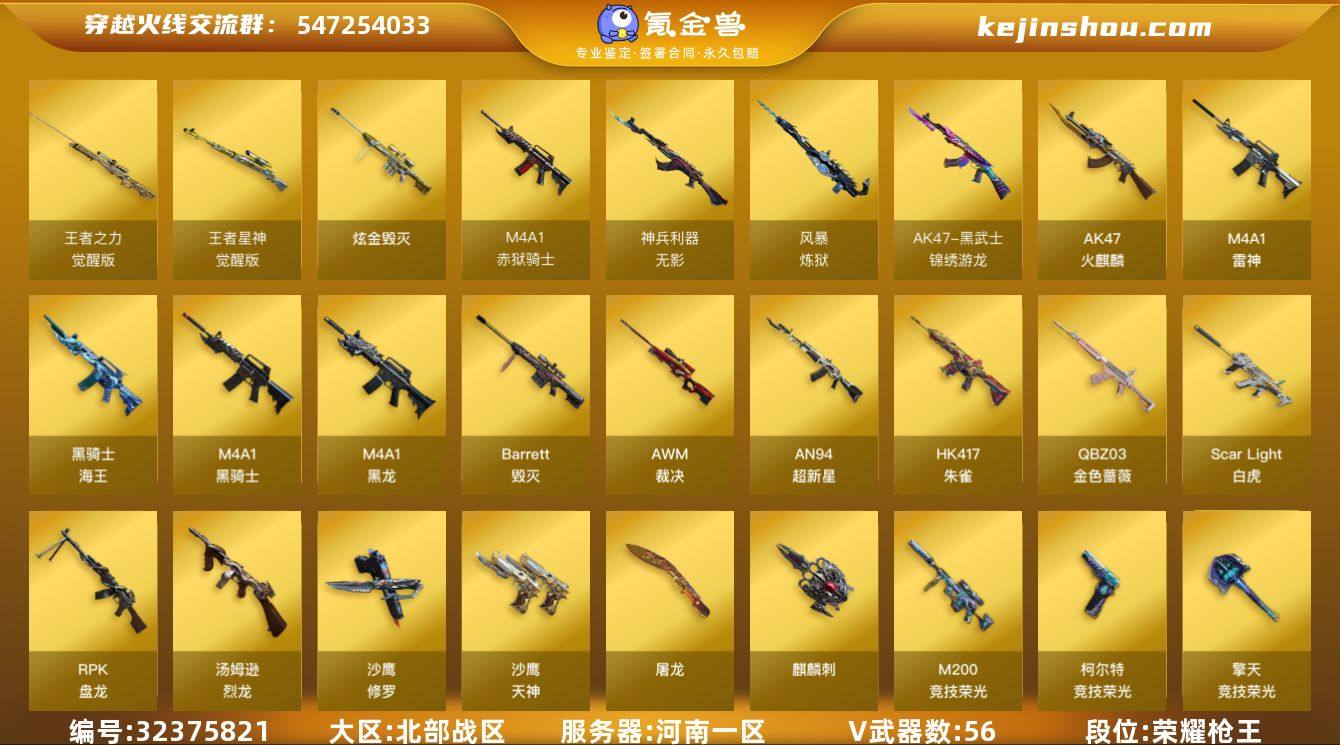 河南一区-58V-2王者-3炫金 【传说角色】:传说影煞 【热门武器】:QBZ03-金色蔷薇,Scar Light-白虎,HK417-朱雀,M200-竞技荣光,死亡之眼,M4A1-黑骑士,汤姆逊-烈龙,RPK-盘龙,雷神-小红,沙鹰-修罗*2 【王者炫金武器】:炫金毁灭*3 【音效卡】:M4A1-黑骑士音效卡 【皮肤】:幻神-AG-CFPL S24冠军 皮肤,白虎-大汉风骨,金色蔷薇-电竞之星 皮肤,裁决-运输船 皮肤,裁决-胜者为王 皮肤,雷神-暗月,雷神-机甲刑天皮肤,雷神-维纳斯皮肤,火麒麟-冠军之心,火麒麟-平天大圣,火麒麟-百城,毁灭-风暴,毁灭-神秘黑洞皮肤,毁灭-英雄计划 皮肤,黑龙-暗月,修罗-能量核心,龙啸-巅峰荣耀 皮肤 【角色】:电竞教官-云悠悠,乔伊教练,修道士,云海玲珑,暗夜-X,初恋灵狐,电竞少女,风暴女*2,虎妞,嘉年华灵狐,娟娟,兰-空鹰,兰妹妹,猎狐者-追月,0号玩家,灵狐-花神,灵狐者-X,灵狐者-黄金海岸,灵狐者-七夕宝贝,龙儿-小淘气,麻雀,曼陀罗-X,曼陀罗-礼服,萌儿,潘多拉-X,潘多拉-甜心教官,青霞仙子,蛇姬,斯沃特-X,蜀雪,铁骑荣耀,兔囡囡,维纳斯,新娜塔莎,雪莉杨,雪莉杨-摸金校尉,夜玫瑰-幻能朋克,樱-战斗天使,影武者-X 【人偶武器】:雷神-小红,AWM-...