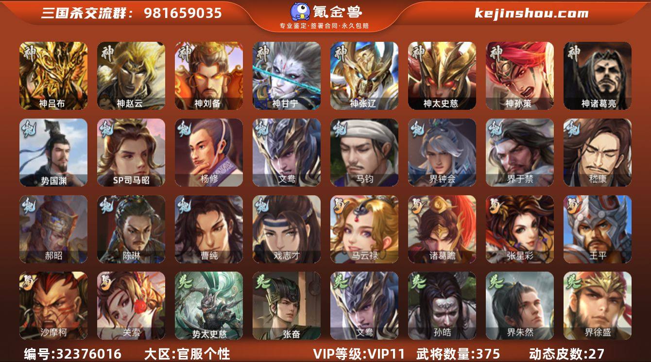 【1830】官阶:大将军;VIP等级:VIP11;史诗武将数量:48;动态皮肤数量:27;武将总数:375;史诗宝珠数量:0;将魂数量:3815;神将:11;魏国史诗武将:29;蜀国史诗武将:6;吴国史诗武将:6;群史诗武将:15