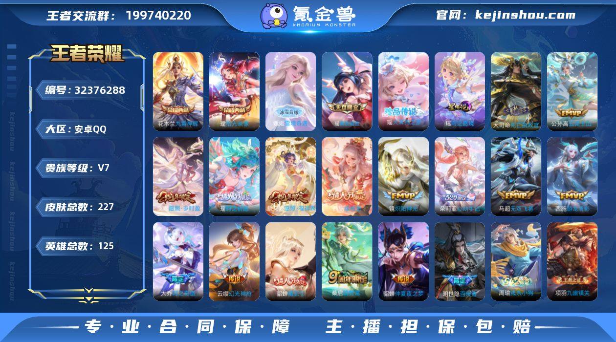 【精品女号·全皮瑶·全皮西施·全皮杨玉环·金标西施·金标大乔·金标露娜·酷洛米之心·器灵落星盏·金色貂蝉·愿照千秋盛·愿照众生和·愿照福禄聚·愿照岁时盈·祈雪灵祝·大乔挚爱花嫁·可二次】w13148-安卓WX-128英雄-288皮肤-12王者印记-210铭文-贵族积分4w【贵族7】【1典藏·1无双·3珍品·1星传说·14传说·1天幕·13按键】【因赛季更新游戏段付以上号为准!】 【英雄全皮】:杨玉环全皮,瑶全皮,西施全皮,阿古朵全皮,戈娅全皮 【荣耀典藏】:瑶拾光映像 【无双皮肤】:瑶真我赫兹 【珍品传说】:嫦娥器灵落星盏,瑶大耳狗之梦,安琪拉酷洛米之心 【星元皮肤】:貂蝉金色仲夏夜 【天幕】:共赏芳华天幕 【传说皮肤】:干将莫邪千山共赴,西施续相思,杨玉环星之鸣奏,女娲愿照千秋盛,妲己愿照众生和,蔡文姬愿照福禄聚,虞姬愿照岁时盈,云缨幻光神枪,大乔挚爱花嫁,瑶时之祈愿,西施游龙清影,小乔音你心动,公孙离祈雪灵祝,达摩黄金狮子座 【限定皮肤】:蒙犽顽岩魄,蔡文姬夏日便利店,大乔绒语心约,虞姬夏日便利店,姜子牙天穹之誓,狄仁杰阴阳师,赵云皇家上将,妲己时之奇旅,孙尚香蔷薇恋人,庄周高山流水,高渐离死亡摇滚,高渐离玩趣恶龙,孙膑寅虎展翼,元歌无心,甄姬女儿...