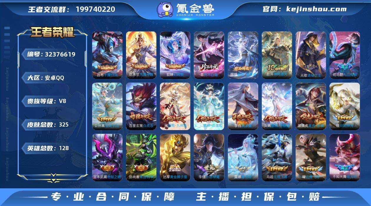 【936493】安卓Q-V9-至尊星耀IV段位-128英雄-325皮肤-1典藏皮肤-2无双-31传说-102史诗 【英雄全皮】:孙权全皮,敖隐全皮,空空儿全皮,影全皮 【荣耀典藏】:伽罗最初的交响 【无双皮肤】:孙悟空无相,曜器灵螭龙剑 【传说皮肤】:阿轲罗刹妄海,云缨神骥越千峰,关羽神骥镇沧海,朵莉亚神骥鸣幻洲,狄仁杰神骥赴朔漠,貂蝉神骥聚万邦,马超神骥逐星野,澜愿照九州拓,云缨幻光神枪,桑启鸣野蒿,项羽无限倾心,后羿无尽星芒,马超无双飞将,孙策挚爱之约,露娜启示之音,孙策末日机甲,瑶时之祈愿,裴擒虎寅虎赤拳,鲁班七号寅虎瑞焰,孙尚香异界灵契,曜李逍遥 ,小乔音你心动,镜炽阳神光,虞姬启明星使,曜云鹰飞将,李信一念神魔,刘备时之恋人,张良黄金白羊座,诸葛亮武陵仙君,宫本武藏地狱之眼,孙悟空地狱火 【限定皮肤】:姜子牙天穹之誓,狄仁杰阴阳师,廉颇寅虎御盾,赵云皇家上将,赵云百木心枪,孙尚香异界灵契,鲁班七号寅虎瑞焰,庄周高山流水,孙膑寅虎展翼,白起夜都怪侠,芈月幻夜卜梦,元歌无心,夏侯惇匿光决锋者,甄姬女儿国国王,典韦岱宗,马可波罗山海玄木吟,狄仁杰魔术师,达摩沙漠行僧,项羽海滩派对,项羽无限倾心,老夫子航海奇遇记,程咬金...