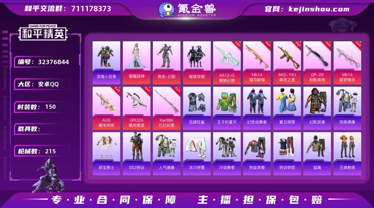 【特价出售/店主推荐】安卓 手Q-3粉装-5特效枪-1载具-2粉色飞行器-55710热力值-11王牌印记-158套装-178枪皮 【热门品类】:套装-深海小丑鱼,套装-粉红小猪 【粉色套装】:粉装-沙场疾风,粉装-碧影闪光,粉装-赤焰黑爵 【粉色枪皮等级】:SCAR-L-青春物语(四级),M762-冷魅冰骑(七级),Kar98K-巳巳如意(五级),AWM-橘柚倾心(四级),DP-28-豹影疾电(五级) 【粉色载具】:焰龙咆哮 【粉色枪皮】:SCAR-L-青春物语,M762-冷魅冰骑,Kar98K-巳巳如意,AWM-橘柚倾心,DP-28-豹影疾电 【粉色飞行器】:庄周梦蝶飞行器 【粉色降落伞】:春暖花开降落伞,四圣焕新降落伞,锦绣火鲤降落伞,洛神天依降落伞,冷魅冰骑降落伞,喜羊羊与灰太狼降落伞,炫彩糖果降落伞 【稀有套装】:套装-巳巳如意,套装-超能元气,角色-超感刻度,套装-雪国风尚,套装-炫彩糖果,套装-星渊小夜曲 【稀有枪皮】:AUG-冰晶雪宝,AKM-夜灯,AKM-彩虹符号,AKM-生命誓言,AKM-破晓战魂,AKM-虎虎生威,AKM-霓虹街区,AKM-龙的传人,M16A4-幻世战舞者,M16A4-红色方程式,SCAR-L-炫彩节奏,SCAR-L-红色方程式,M416-夜灯,M416-糯团青竹,M416-紫翼圣骑,GROZA-异彩先驱,GROZA-彩虹符号,GROZA-治愈之星,GROZA-马卡龙,GROZA-黑色刀锋,AUG-天降萌叽,AUG-耀粉歌者,AUG-绝对恒星,QBZ-原初圣火,QBZ-彩虹符号,QBZ-洛神天依,QBZ-绚金瑰梦,QBZ-飞驰魅影,M762-天降萌叽,M762-彩虹符号,M762-拳皇97,M762-牛气冲天,M762-瑞龙福将,M762-镭射皇者,Mk47-妙红点点,G36C-暗夜玫瑰,AC-VAL-天降萌叽,蜜獾-天降萌叽,UZI-啾咪啾咪,UZI-幻影战神,UZI-炫彩节奏,UZI-红色方程式,UMP45-夜灯,UMP45-生命誓言,Vector-彩虹符号,Vector-暗夜玫瑰,Vector-治愈之星,Vector-生命誓言,汤姆逊-异彩先驱,汤姆逊-炫彩节奏,汤姆逊-耀粉歌者,MP5K-...
