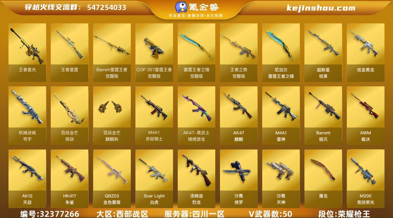 四川一区-72V-24王者武器数-1炫金武器数 【传说角色】:传说星骇 【热门武器】:QBZ03-金色蔷薇,Scar Light-白虎,HK417-朱雀,M200-竞技荣光,汤姆逊-烈龙*2,沙鹰-修罗*2 【王者炫金武器】:超新星-悦享,王者星霆,王者星光,炽渊之怒,雷霆王者之锋*2,炫金黑龙 【音效卡】:屠龙-云海游龙音效卡,M4A1-雷神音效卡,QBZ03-金色蔷薇音效卡,AWM-裁决音效卡,Scar Light-白虎音效卡 【皮肤】:幻神-荣耀世冠EP 皮肤,白虎-百战金芒 皮肤,金色蔷薇-破浪逐光 皮肤,QBZ03-荣耀世冠EP 皮肤,裁决-流光秘银,裁决-叶芒苍灵 皮肤,雷神-耀金皮肤,雷神-宇航兔皮肤,M4A1-再燃火线,毁灭-暗月,毁灭-SV-CFPLS16冠军,毁灭-虹光风暴 皮肤,黑骑士-地狱火,黑骑士-伏羲,修罗-冠军之魂,屠龙-星火燎原,屠龙-破浪逐光 皮肤,轻型军用手斧-再燃火线 【角色】:电竞教官-云悠悠,晴雅,迅捷虹喵,零·纪元,王者炫,修道士,葵-阿尔法武装,暗夜-X,北极狐-X,芳心审判者,飞虎队-X,风暴女,兰-新年限定,灵狐者-X,潘多拉-X,潘多拉-甜心教官,幽 【人偶武器】:星神-炽天使,异变清道夫-蛇影双骄,迷你律动酷熊,夺魂,迷你艾比,迷你超能女侍 【暴走生化】:超级对讲机 【英雄级...