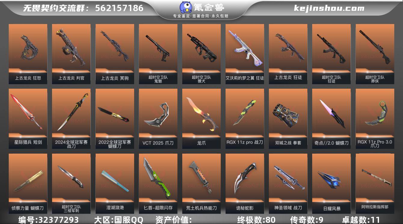 【Hww503】Q区 可二次 皮肤价值189120【80橙皮 9金皮 11紫皮 191皮肤 25英雄 163卡面 1650已用源晶】 铂金 优质装备:2024全球冠军赛套装,2022全球冠军赛套装,超时空卫队套装,VCT 2025 赛季套装,奇点//2.0套装,回火礼包:奇点套装 【套装】:2024全球冠军赛套装,2022全球冠军赛套装,超时空卫队套装,上古龙炎套装,RGX 11z Pro套装,虚空遗器套装,VCT 2025 赛季套装,西部未来套装,创·纪元套装,混沌序曲套装,《双城之战》收藏套装,归零者//2.0套装,光明哨兵套装,奇点//2.0套装,黯夜怪谈套装,毁灭骑士套装,VCTxEDG 队伍套装,回火礼包:奇点套装,般若假面//2.0套装 【英雄】:幻棱,炼狱,维斯,暮蝶,钛狐,壹决,铁臂,捷风,雷兹,幽影,不死鸟,贤者,猎枭,蝰蛇,零,芮娜,奇乐,尚勃勒,霓虹,夜露,星礈,K/O,盖可,钢锁 【近战武器】:近战武器-2024全球冠军赛 战刀,近战武器-2022全球冠军赛 蝴蝶刀,近战武器-超时空卫队 三棱军刺,近战武器-RGX 11z Pro 战刀,近战武器-侦察力量 蝴蝶刀,近战武器-奇点//2.0 蝴蝶刀,近战武器-VCT 2025 爪刀,近战武器-紫金爪刀,近战武器-RGX 11z Pro//3.0 爪刀,近战武器-黑波之刃,近战武器-落英飞旋,近战...