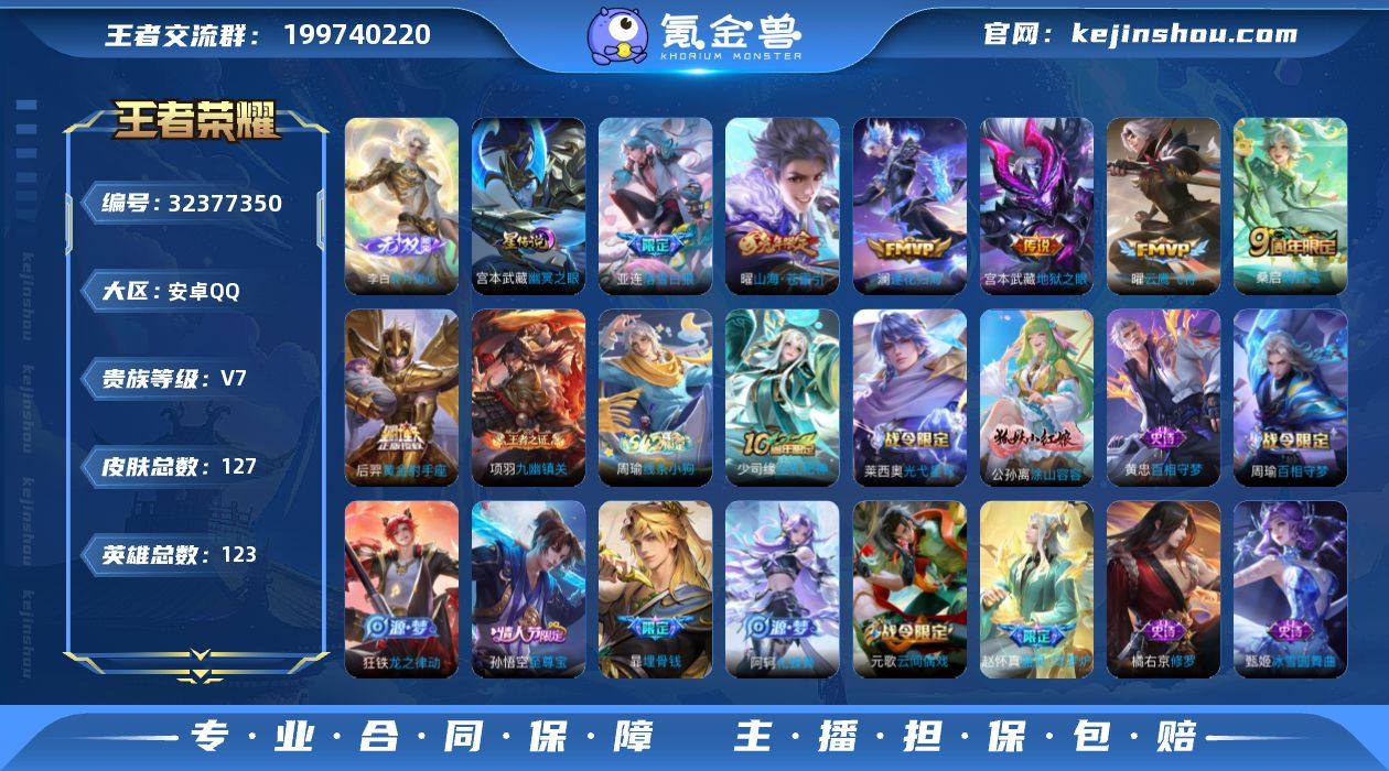 安卓Q-V7-最强王者段位-123英雄-127皮肤-1无双-7传说-41史诗【英雄全皮】:孙权全皮【无双皮肤】:李白碎月剑心【传说皮肤】:桑启鸣野蒿,亚连落雪白狼,澜逐花归海,曜山海苍雷引,曜云鹰飞将,后羿黄金射手座,宫本武藏地狱之眼【限定皮肤】:暃埋骨钱,虞姬夏日便利店,狄仁杰阴阳师,赵云皇家上将,元歌云间偶戏,元歌无心,狄仁杰魔术师,项羽海滩派对,孙悟空至尊宝,裴擒虎李小龙,曜山海苍雷引,李白碎月剑心,亚连落雪白狼,沈梦溪龙舞盛年【年限皮肤】:曜山海苍雷引【赛季限定】:东皇太一噬灭天穹,太乙真人谧流熔炉,钟馗虚灵犬护,甄姬逆浪荇歌,亚瑟荣光之誓,项羽九幽镇关【战令限定】:元歌云间偶戏,虞姬夏日便利店,百里守约百相守梦,老夫子百相守梦,孙膑茶境仙,马超访茗客,周瑜百相守梦,孙策百相守梦,莱西奥光弋星穹,明世隐往忆晖光,周瑜线条小狗【史诗皮肤】:周瑜线条小狗,项羽九幽镇关,少司缘巫礼祀神,莱西奥光弋星穹,公孙离涂山容容,黄忠百相守梦,周瑜百相守梦,狂铁龙之律动,阿轲化蝶舞,赵怀真器灵浮梦炉,弈星万物之道,孙膑茶境仙,百里守约百相守梦,暃埋骨钱,镜玫瑰异探,元歌无心,澜赏金猎手,司马懿暗渊魔法,杨戬天秀启明...