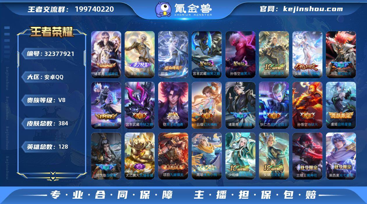 【精品v9推荐·金标万战李信·金标准万战露娜·金标廉颇·金标鲁班大师·金标高渐离·武则天·九霄神辉·诡秘之主·九山相柳·山海炽霜斩·诗剑行·深海之息·挚爱之约·寅虎赤拳·孙尚香异界灵契·李逍遥·祈雪灵祝·白虎志·至尊宝·大圣娶亲·神威·可二次】YXw18304-安卓Q-129英雄-340皮肤-21王者印记-300铭文-贵族积分10w【贵族9】【2典藏·3星传说·25传说·1天幕·17按键】【因赛季更新游戏段付以上号为准!】 【英雄全皮】:司马懿全皮,刘邦全皮,狂铁全皮,猪八戒全皮 【荣耀典藏】:武则天英雄,花木兰九霄神辉 【星元皮肤】:孙尚香未来机甲,狄仁杰星际治安官,武则天幻海之心 【天幕】:共赏芳华天幕 【传说皮肤】:干将莫邪千山共赴,元歌诡秘之主,大司命死亡执政官,司马懿九山相柳,李信山海炽霜斩,李白诗剑行,马可波罗深海之息,马超无双飞将,孙策挚爱之约,露娜启示之音,裴擒虎寅虎赤拳,孙尚香异界灵契,西施游龙清影,曜李逍遥 ,李元芳飞鸢探春,公孙离祈雪灵祝,镜炽阳神光,虞姬启明星使,曜云鹰飞将,李信一念神魔,百里玄策白虎志,孙尚香末日机甲,宫本武藏地狱之眼,武则天海洋之心,狄仁杰超时空战士 【限定皮肤】:白起狰,狄仁杰阴阳师,虞姬凯尔特女王,赵云皇家上...