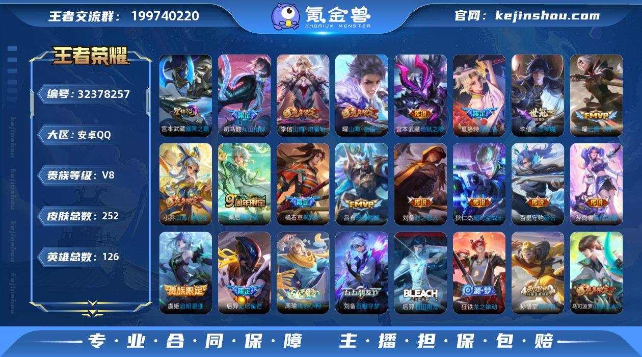 贵族8/皮肤254/典藏2/传说16/史诗76/英雄128/孙权全皮/梦奇全皮/敖隐全皮/杀手不太冷/最初的交响/金色仲夏夜/幽冥之眼/兔狲·蓬尾/黑崎一护/神树通天/愿照·岁时盈/玄雷天君/貂蝉曦玄引/乘龙·问璇玑/绯月行/补天/异界灵契/时雨天司/炽阳神光/启明星使/一念神魔/久胜战神/胖达荣荣/仲夏夜之梦/地狱之眼/天穹之誓(s36)/阴阳师/皇家上将/神迹守卫-墨子/高山流水/超时空战士-钟无艳/夜都怪侠/幻夜卜梦/无心/女儿国国王/落雪兰心/山海·玄木吟/魔术师/沙漠行僧(s26)/海滩派对/圣诞老人/航海奇遇记/冰锋战神/演武夺筹(s23)/午后时光/金庭之子(s27)/青春决赛季/孙行者/圣弓游侠/云中旅人(s29)/神迹守卫-钟馗/驱傩正仪(s24)/冰霜恋舞曲/胡桃夹子/真爱魔法/黎明之约/五谷丰年/火炮绅士/千军破阵(s25)/原初追遂者/顽趣-梦奇/天降福星/玉兔公主/大漠名商(s28)/吟游魔法/擒涛扼浪(s31)/电玩高手/梁祝/拒霜思/暖冬·兔眠/玲珑珍味/探海日志(s32)/匿光追影者/海盐诗旅(s30)/星界游侠/古海寻踪(s33)/鬼谷子天穹祈灯(S34)/妄想食味/剑破天穹(s35)/程咬金群星魔术团/青焰无极/苍威无极/刘备异域游侠/芈月浮光幕影/谧流熔炉/荣光之誓/茶境仙/访茗客/鸭鸭历险记-刘禅/鸭鸭历险记-沈梦溪/线条小狗-周瑜/苍穹之光/未来纪元-赵云/圣诞恋歌/冰雪圆舞曲/偶像歌手/地狱岩魂/鬼剑武藏/水果甜心/暗夜贵公子/摇滚巨星/魅力维加斯/女仆咖啡/龙骑士/金属风暴/绅士熊喵/幽灵船长/千年之狐/末日机甲-吕布/德古拉伯爵/缤纷独角兽/暗隐猎兽者/心灵战警/心灵骇客/特工魅影/逐浪之夏/功夫厨神/星夜王子/节奏热浪/猫狗日记-孙策/鹰眼统帅/白蛇/魅语/修罗/诗语江南/天秀·启明/时之奇旅-安琪拉/暗渊魔法/电玩·爆裂旋风/东方月初/龙之律动/雪豹·霜爪/石田雨龙/罗小黑战记/万灵启世/教廷特使/街头霸王/哥特玫瑰/忍·炎影/白色死神/西部大镖客(牛魔)/化身博士/救世...