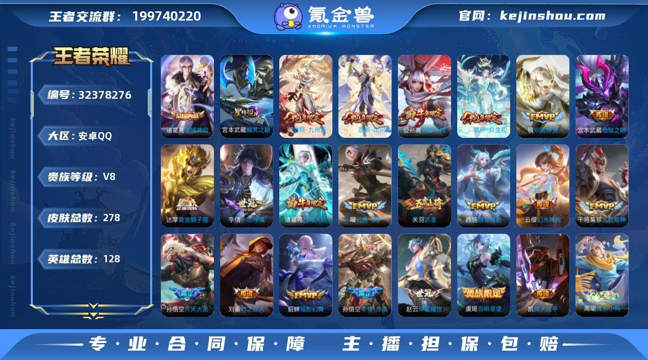 王者19676,不可二次,217夺宝,1835星币,安卓Q-V8-至尊星耀III段位-128英雄-278皮肤-1典藏皮肤-21传说-85史诗 【英雄全皮】:孙权全皮,赵怀真全皮,空空儿全皮 【荣耀典藏】:诸葛亮星域神启 【传说皮肤】:司空震愿照山河定,妲己愿照众生和,澜愿照九州拓,云缨幻光神枪,孙悟空齐天大圣,赵云淬星耀世,西施游龙清影,公孙离祈雪灵祝,诸葛亮时雨天司,铠绛天战甲,镜炽阳神光,虞姬启明星使,孙悟空零号赤焰,关羽武圣,曜云鹰飞将,李信一念神魔,刘备时之恋人,貂蝉猫影幻舞,干将莫邪久胜战神,达摩黄金狮子座,宫本武藏地狱之眼 【限定皮肤】:白起狰,狄仁杰阴阳师,虞姬凯尔特女王,赵云皇家上将,孙尚香蔷薇恋人,鲁班七号狮舞东方,庄周云端筑梦师,庄周高山流水,高渐离玩趣恶龙,阿轲迷踪丽影,孙膑天狼运算者,芈月重明,芈月白晶晶,吕布御风骁将,周瑜赤莲之焰,元歌云间偶戏,元歌无心,夏侯惇朔风刀,曹操烛龙,典韦蓝屏警告,马可波罗暗影游猎,狄仁杰魔术师,狄仁杰万华元夜,达摩沙漠行僧,项羽海滩派对,老夫子醍醐杖,关羽武圣,程咬金演武夺筹,刘邦夺宝奇兵,兰陵王驯魔猎人,兰陵王金庭之子,亚瑟潮玩骑士王,孙悟空大圣娶亲,孙悟空零号赤焰,...