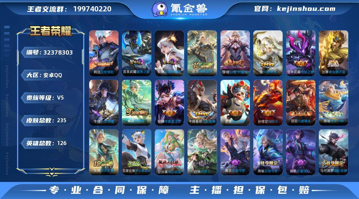 王者19717,安卓Q-V5-最强王者段位-126英雄-235皮肤-1典藏皮肤-11传说-59史诗 【英雄全皮】:孙权全皮,影全皮 【荣耀典藏】:韩信弑枪猎影 【传说皮肤】:后羿神树通天,桑启鸣野蒿,李信山海炽霜斩,镜炽阳神光,李信一念神魔,干将莫邪久胜战神,达摩黄金狮子座,梦奇胖达荣荣,貂蝉仲夏夜之梦,宫本武藏地狱之眼,孙悟空地狱火 【限定皮肤】:姜子牙天穹之誓,狄仁杰阴阳师,赵云皇家上将,孙尚香蔷薇恋人,庄周高山流水,元歌无心,甄姬游园惊梦,马可波罗暗影游猎,狄仁杰万华元夜,达摩沙漠行僧,项羽海滩派对,程咬金演武夺筹,兰陵王金庭之子,李元芳云中旅人,钟馗驱傩正仪,杨戬潮玩骑兵,干将莫邪胡桃夹子,雅典娜黎明之约,鬼谷子五谷丰年,苏烈千军破阵,梦奇顽趣,沈梦溪大漠名商,裴擒虎李小龙,裴擒虎擒涛扼浪,李信山海炽霜斩,鲁班大师探海日志,桑启海盐诗旅,艾琳女武神,阿古朵江河有灵,张良古海寻踪,蒙恬荣光圣徽,鬼谷子天穹祈灯,沈梦溪龙舞盛年,鲁班七号蔬乡物语,李元芳蔬乡物语,刘邦剑破天穹,程咬金群星魔术团,镜青焰无极,项羽苍威无极,周瑜熔金海岸 【年限皮肤】:李信山海炽霜斩 【赛季限定】:狄仁杰万华元夜,程咬金演武夺筹,钟馗驱...