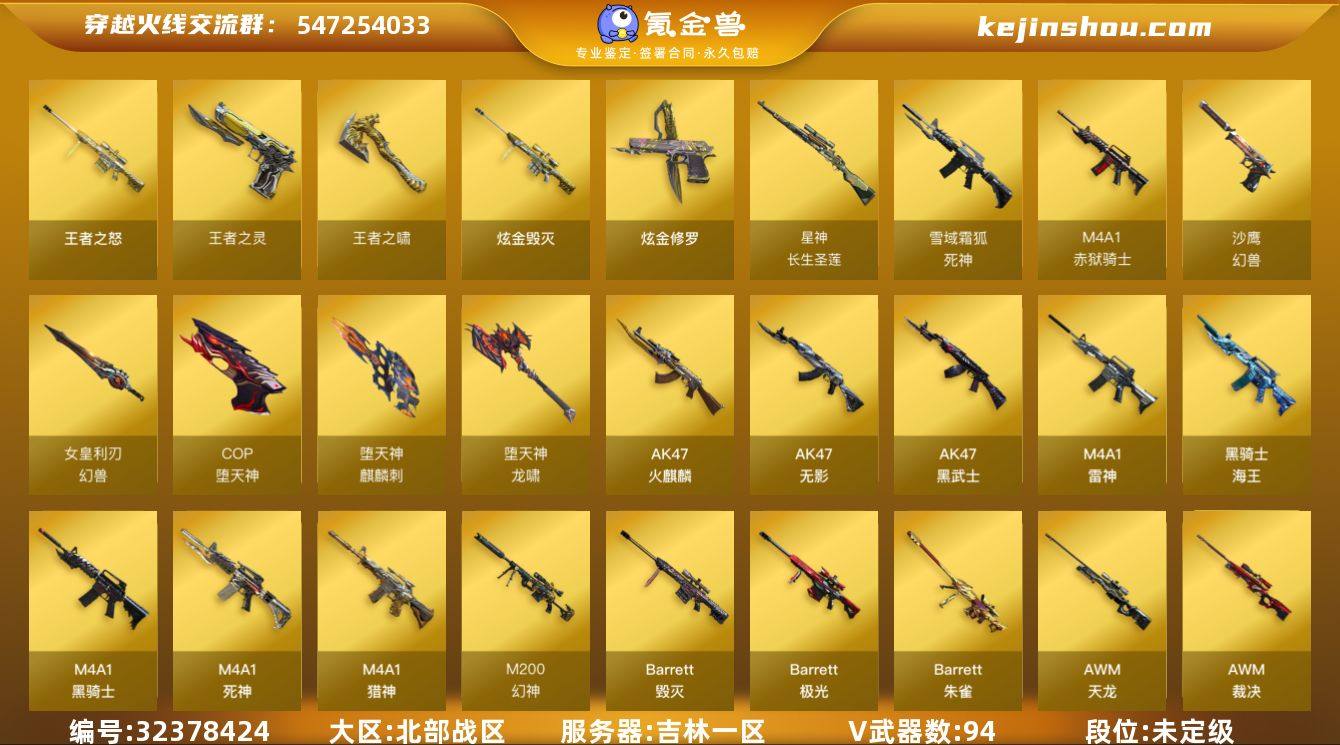 吉林一区-108V-9王者武器数-3炫金武器数 【热门武器】:Scar Light-白虎,M200-幻神,死亡之眼*2,M4A1-黑骑士,汤姆逊-烈龙*6,加特林-炼狱*3,斯泰尔-蝴蝶,COP-堕天神,沙鹰-修罗*6,金刚伞*2,高爆手雷-幻兽 【王者炫金武器】:王者之怒,王者之灵,王者之啸,炫金骑士,炫金毁灭,炫金修罗 【音效卡】:AK47-火麒麟音效卡,M4A1-雷神音效卡,M4A1-黑骑士音效卡,Barrett-毁灭音效卡,Scar Light-白虎音效卡,沙鹰-修罗-盛典舞曲音效卡*2,Barrett-碧霄极光音效卡*3,麒麟刺-百战金芒-盛典舞曲音效卡,白虎-盛典舞曲音效卡,炼狱-百战金芒-庆典舞曲音效卡,死神-雪域霜狐-怀旧音效卡,AWM-昌龙-怀旧音效卡 【皮肤】:幻神-AG-CFPLS17冠军,裁决-胜者为王 皮肤,雷神-暗月,雷神-能量核心,雷神-荣耀之魄,M4A1-雷神-CFS 2019,雷神-冠军之魄,M4A1-再燃火线,火麒麟-冠军之心,传奇石头-横秒之巅,火麒麟-平天大圣,毁灭-CFS2020,毁灭-SV-CFPLS16冠军,毁灭-百城浙江 皮肤,毁灭-英雄计划 皮肤,黑骑士-暗月,黑骑士-冠军之势,无影-暗月,天启-暗月,战神-流金岁月皮肤,天龙-能量核心,极光-能量核心*2,修罗-能量核心,龙啸-冠军之啸,轻型军用手斧-再燃火线,擎天-秘...