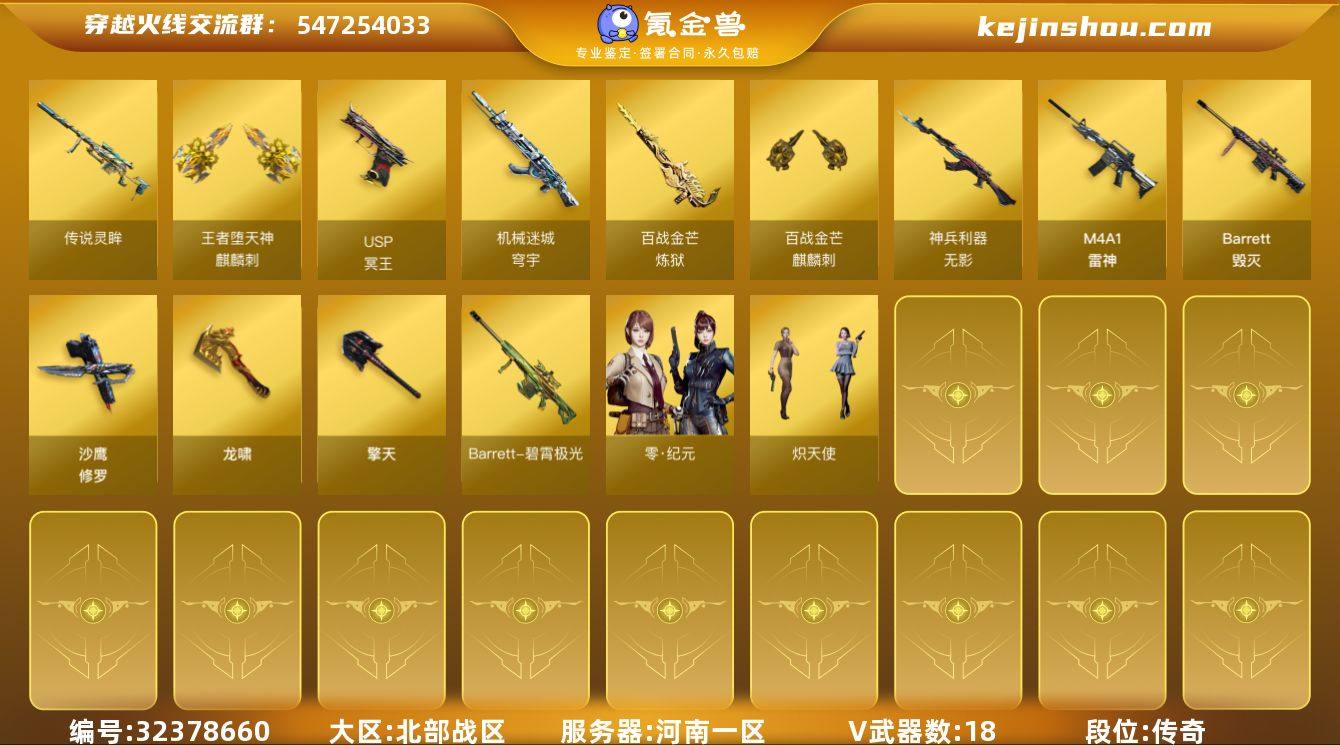 【ky6315】河南一区-24V-1王者武器数-0炫金武器数 【传说武器】:传说灵眸 【热门武器】:传说灵眸,沙鹰-修罗 【王者炫金武器】:麒麟刺-王者堕天神 【音效卡】:炼狱-百战金芒-庆典舞曲音效卡 【皮肤】:雷神-紫凛 皮肤,M4A1-再燃火线,修罗-百战金芒 皮肤,轻型军用手斧-再燃火线 【角色】:零·纪元,乔伊教练,葵-阿尔法武装,幻面灵狐,炽天使,嘉年华灵狐,龙儿-小淘气,麻雀,潘多拉-X,潘多拉-甜心教官,斯沃特-X 【人偶武器】:AWM-灵狐-15周年嘉年华,迷你裂空之翼,迷你波特博士,夺魂,迷你巨石泰坦-魔花研究所 【暴走生化】:超级对讲机 【挑战大师】:AK47-冰龙粉碎者,冰龙粉碎者-白马银枪,激光毁灭者III-白马银枪 【英雄级武器】:M4A1-雷神,无影-神兵利器,HK417-朱雀-电竞之星,机械迷城-穹宇,Barrett-毁灭,炼狱-百战金芒,沙鹰-修罗,USP-冥王,龙啸,擎天*2,麒麟刺-百战金芒,屠龙-电竞之星,屠龙-斗烈龙驹,AK47-竞魂无影,Barrett-碧霄极光 【源级武器】:源·火麒麟*2,魂·火麒麟-百城,源-黑龙,源·雷神*2,魂·M4A1-雷神-化蛇,魂·雷神-诺拉,魂·雷神-神秘按键,魂·雷神-新春神龙*2,魂-雷神-萌杀,魂·雷神-15周年嘉年华,御·雷神-机甲刑天,源·...