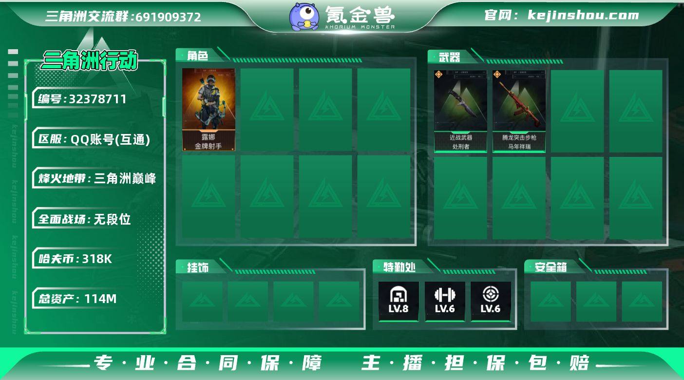 A11443/可二次/QQ区【总资产:114.2M+近战暗星+近战处刑者+S8赛季3X3+锦绣捆绑包】/烽火等级:60级/全面战场:6级/纯币:318K/三角券加币:23(三角币23)【近战-暗星/近战-处刑者】【露娜-金牌射手】/部门:22321/特勤等级(技术中心3级/工作台3级/制药台3级/防具台3级/仓库8级/指挥中心5级/训练中心6级/靶场6级/潜水中心1级/收藏室1级)(流动资产:83M)SKS射手步枪-骑士/腾龙突击步枪-马年祥瑞/4橙色挂饰/段位:三角洲巅峰X30/详细看图